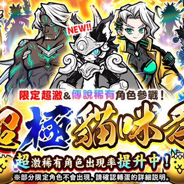 貓咪大戰爭》的稀有轉蛋加入了對鋼鐵敵人有特效的各種超激角色集合而成的「鋼鐵破壞者」系列!快來獲得超激角色們的力量,打倒鋼鐵敵人!活動期間中於遊戲中點選稀有轉蛋,就可以看到「鋼鐵破壞者」的轉蛋活動唷!