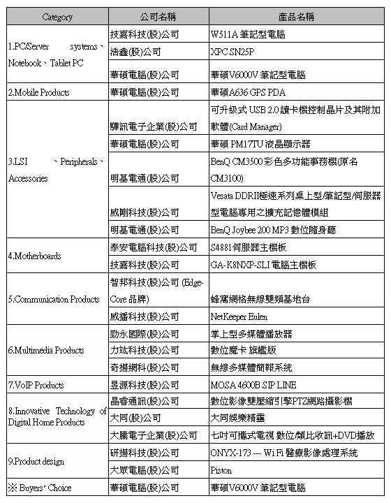 第四屆「台灣最佳外銷資訊產品獎(Best Choice of COMPUTEX)」得獎名單於昨日的「COMPUTEX TAIPEI 2005 台北國際電腦展」開幕記者會中同步揭曉並頒獎。
