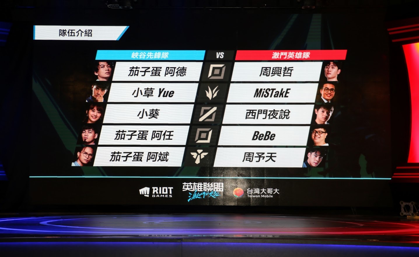 英雄聯盟:激鬥峽谷 》 明星表演賽則是由人氣樂團茄子蛋結盟知名實況主小草 Yue、小葵組成「峽谷先鋒隊」, 對戰創作才子周興哲、周予天與 BeBe、西門夜說及 MiSTakE 的「激鬥英雄隊」,展開五對五的激烈對戰。