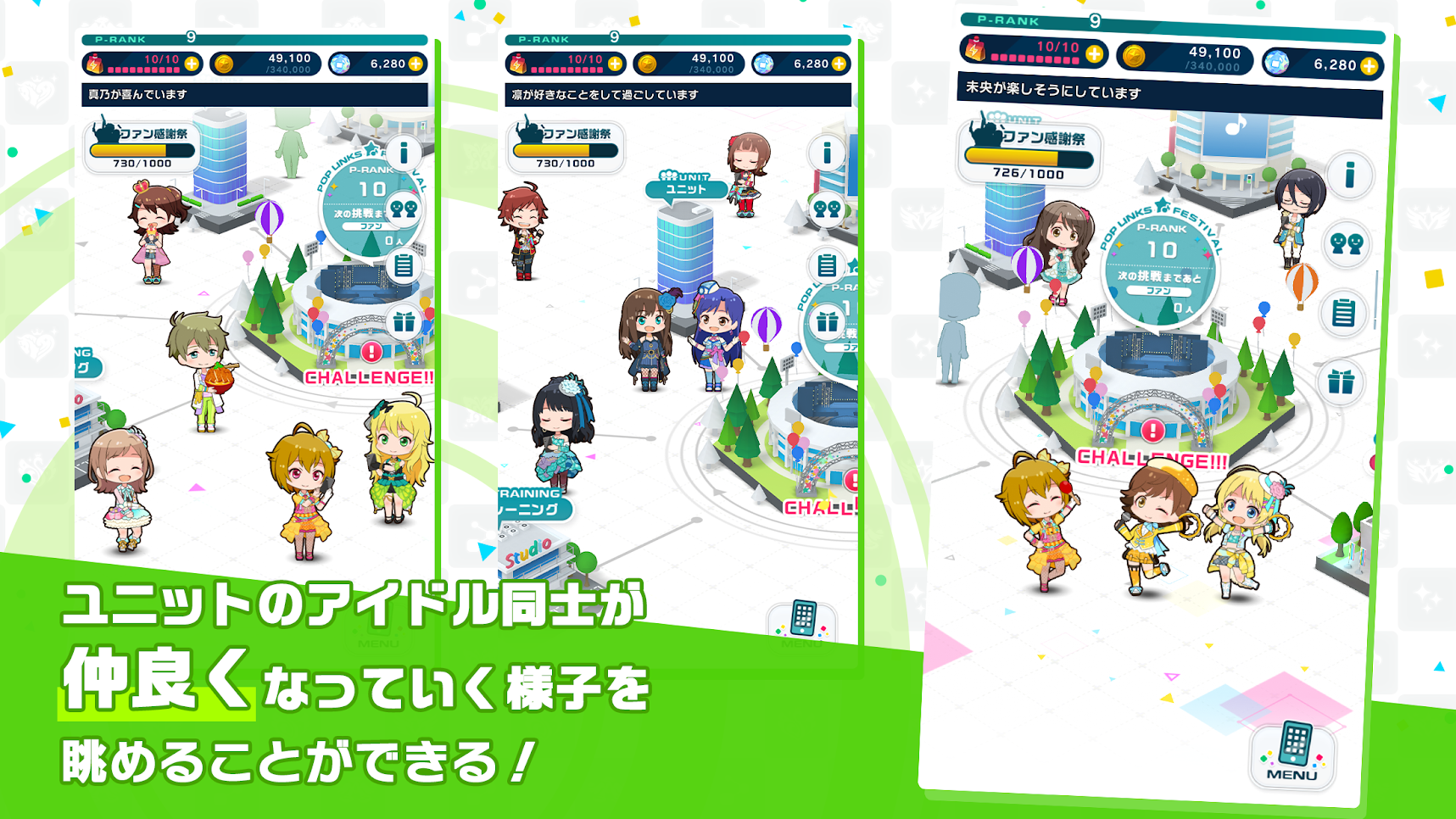 偶像大師》系列的偶像們同台表演。遊戲故事描述,偶像大師的偶像們受到事務所的請託,以每三個人組成團體來參加大型演唱會『POPLINKS 祭』,製作人將在這場大型演唱會以頂點為目標,為原創團體進行培育。