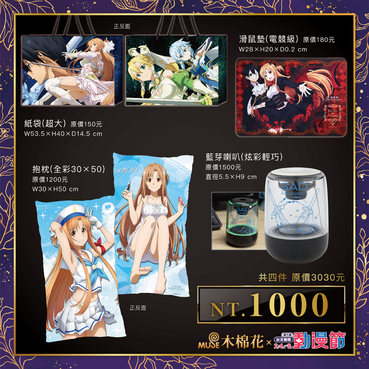夏目友人帳》福袋有不倒翁造型的「貓咪老師」玩偶,讓你考試都合格順利,同時讓「貓咪老師」印花毛毯陪你一起渡過寒冬吧!《刀劍神域》大紙袋一次可以包走三位女主角,組合含「藍薔薇」與「夜空」雙劍藍芽喇叭,在夜晚中享受音樂播出時還可以隨心變換背景燈,隨時品味音樂的躍動感。經典情侶「桐人」以及「亞絲娜」也成為實用的電競滑鼠墊來陪伴大家,喜歡的朋友快筆記起來!即將播出第二季的《