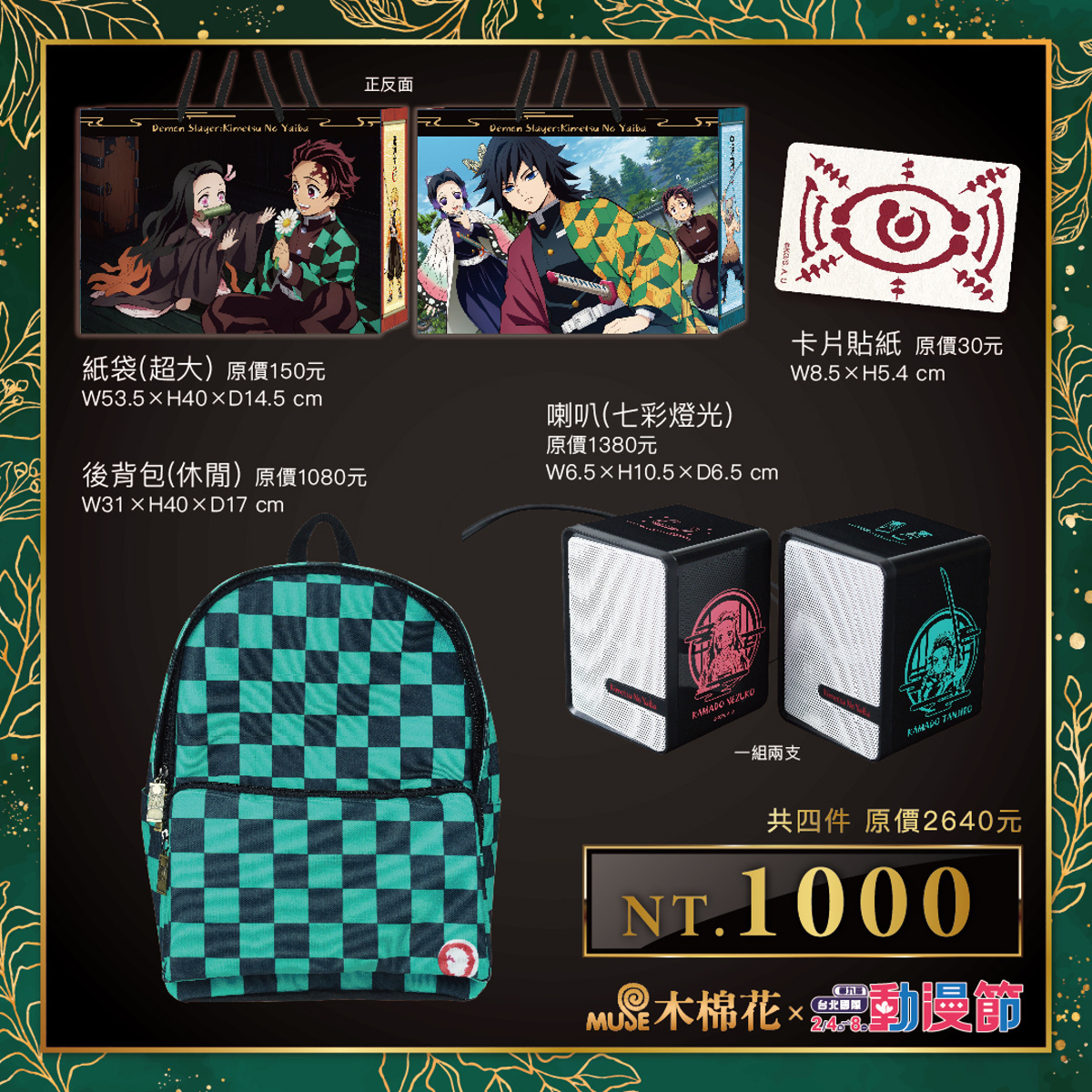 鬼滅之刃》也推出的「炭治郎」風格綠黑格紋休閒後背包、以及可變換七彩燈光的喇叭組,兩面印有「炭治郎」以及「禰豆子」,讓你同時擁有人氣兄妹檔。另外還有「血鬼術」咒文貼紙,讓你把惡鬼招式一網打盡!熱播中的《