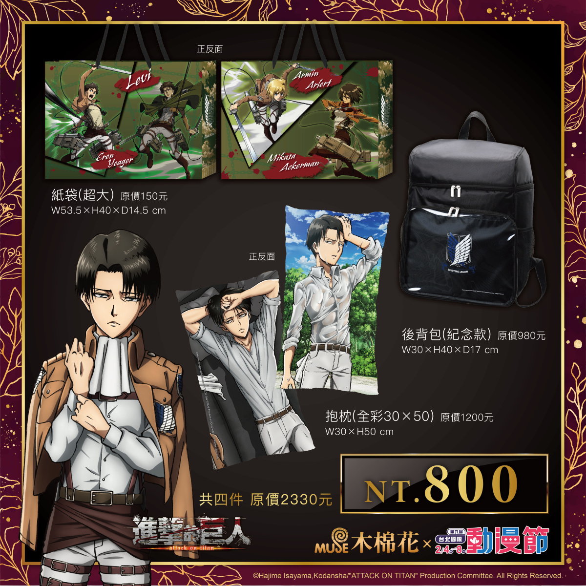 進擊的巨人》推出的是「紀念款後背包」,外觀是調查兵團的象徵「自由之翼」,內裝印有經典場景,粉絲可以回味名場景的瞬間,還有霸氣「兵長」的雙面全彩抱枕讓你帶回家!2 月將上映劇場版的《