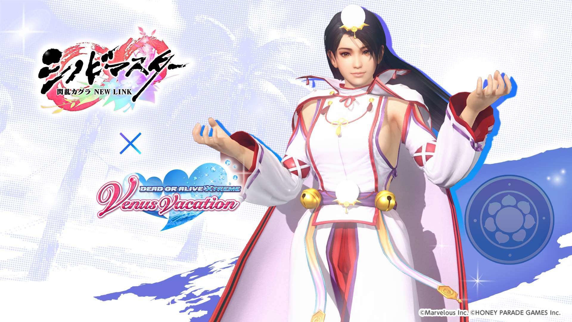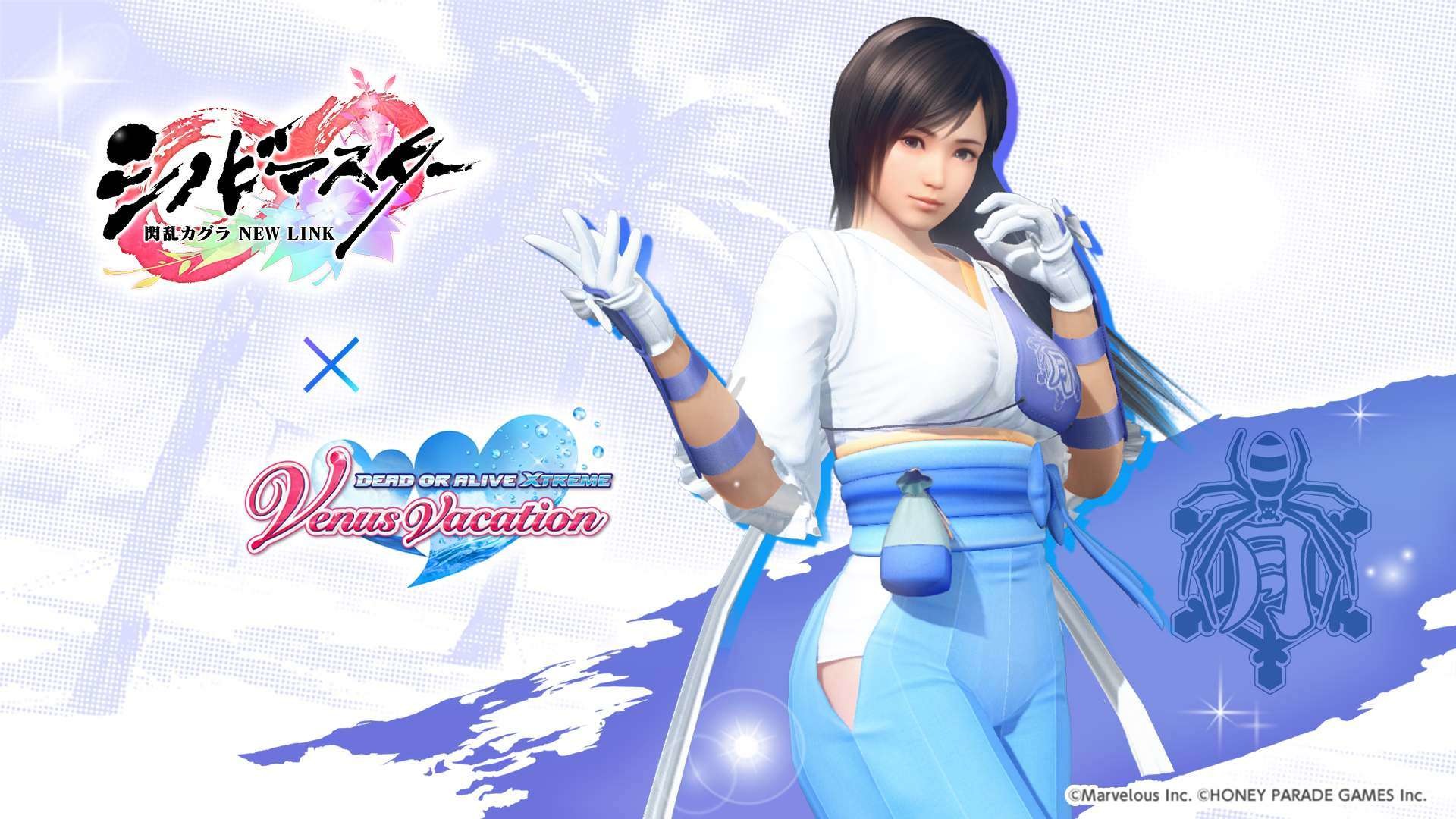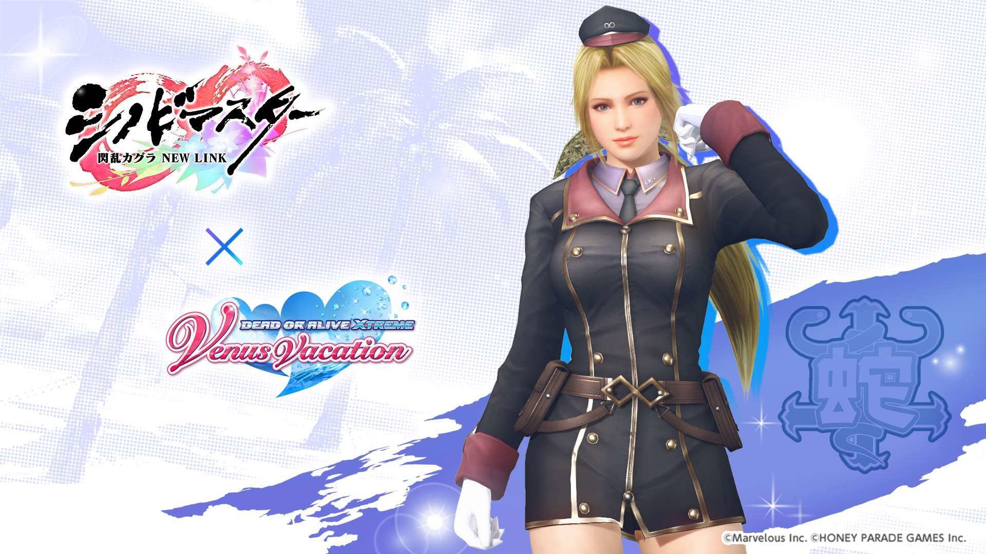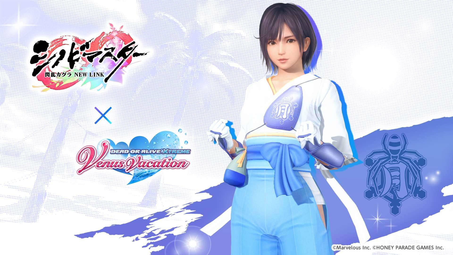 忍者大師 閃亂神樂 NEW LINK》聯動紀念活動之一,期間限定的風潮穿搭抽卡將於本日開始,本抽卡中 SSR 泳裝出現機率為平常的三倍,玩家有機會獲得「半藏忍裝束」「巫神樂忍裝束」等聯動泳裝。其他還有每日 1 次免費維納斯抽卡 10 連,以及「島主應援證試用版」,試用版可 7 天免費體驗每日競賽消費 FP 減半、報酬 2 倍掉落等特典。