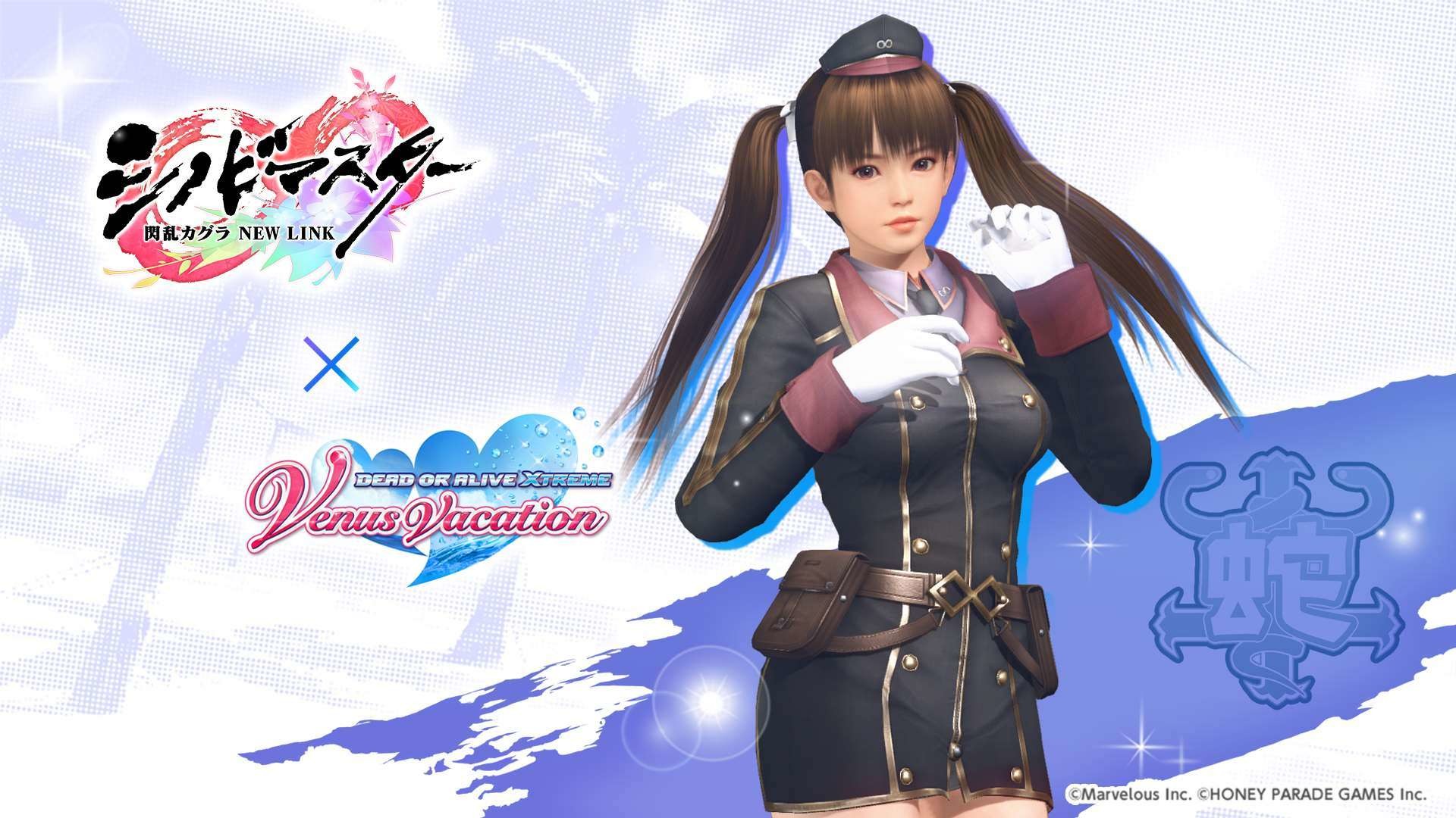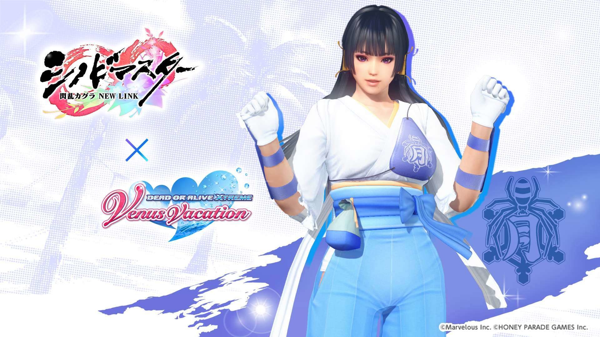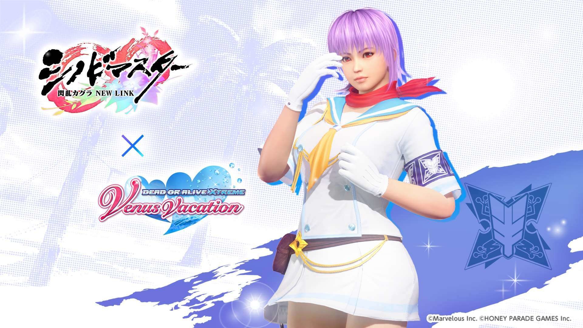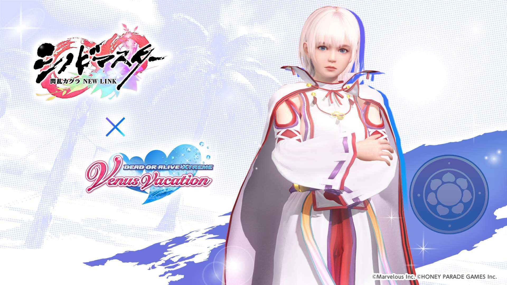 忍者大師 閃亂神樂 NEW LINK》聯動紀念活動之一,期間限定的風潮穿搭抽卡將於本日開始,本抽卡中 SSR 泳裝出現機率為平常的三倍,玩家有機會獲得「半藏忍裝束」「巫神樂忍裝束」等聯動泳裝。其他還有每日 1 次免費維納斯抽卡 10 連,以及「島主應援證試用版」,試用版可 7 天免費體驗每日競賽消費 FP 減半、報酬 2 倍掉落等特典。