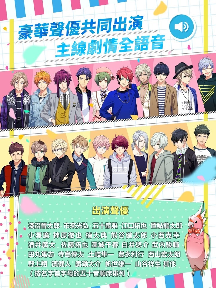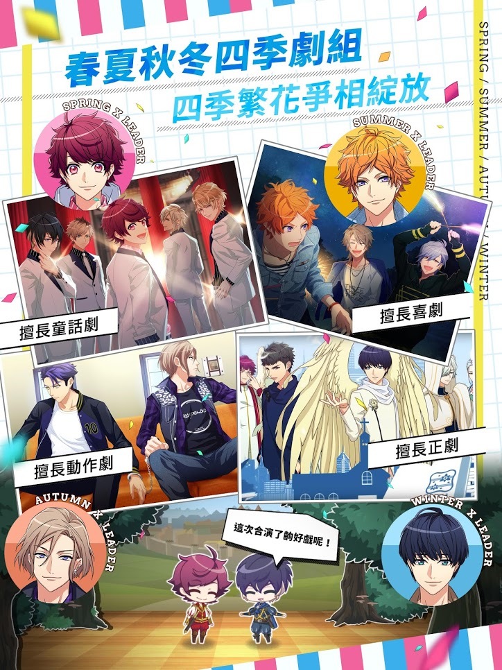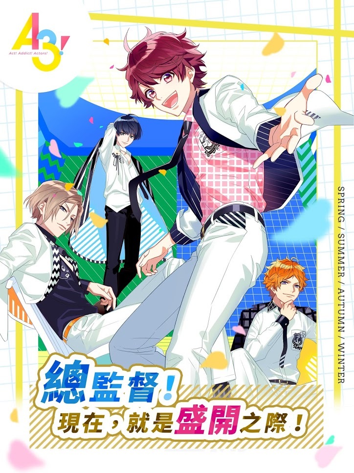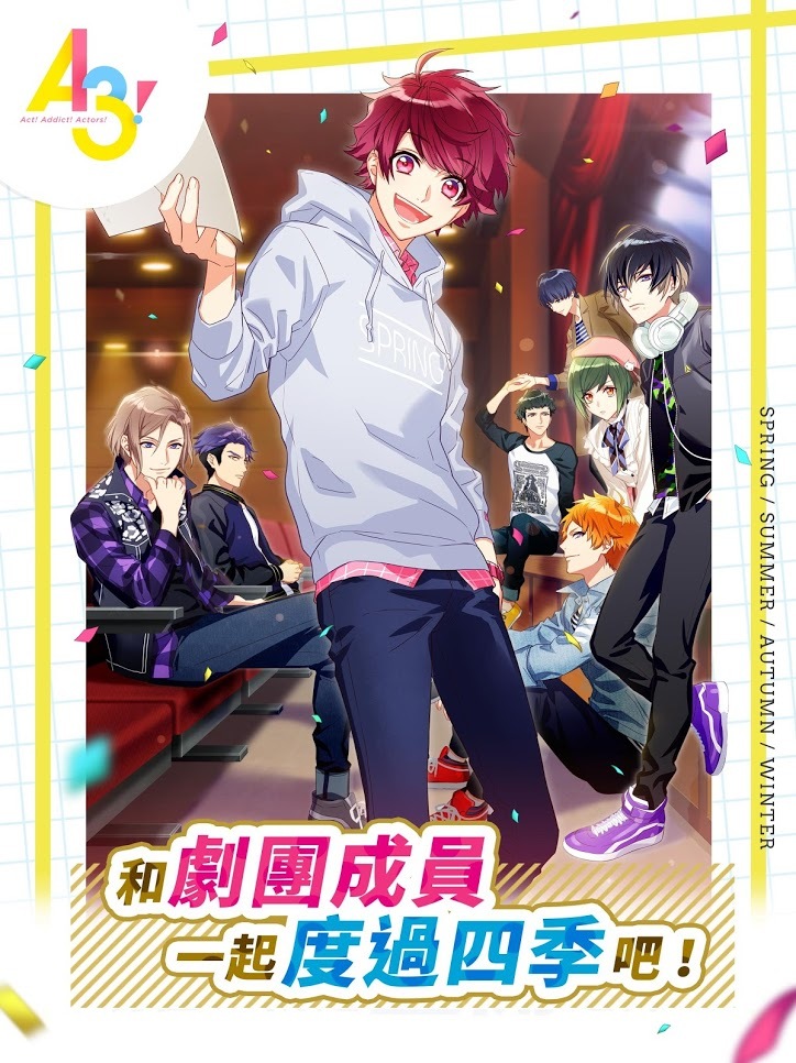 A3!》結合帥氣演員育成,以細膩的舞台劇劇情、華麗服飾、聲優配音等特色,打造玩家與男演員們之間的零距離互動,與玩家一起編織一場充滿青春、熱血的公演旅程回憶。