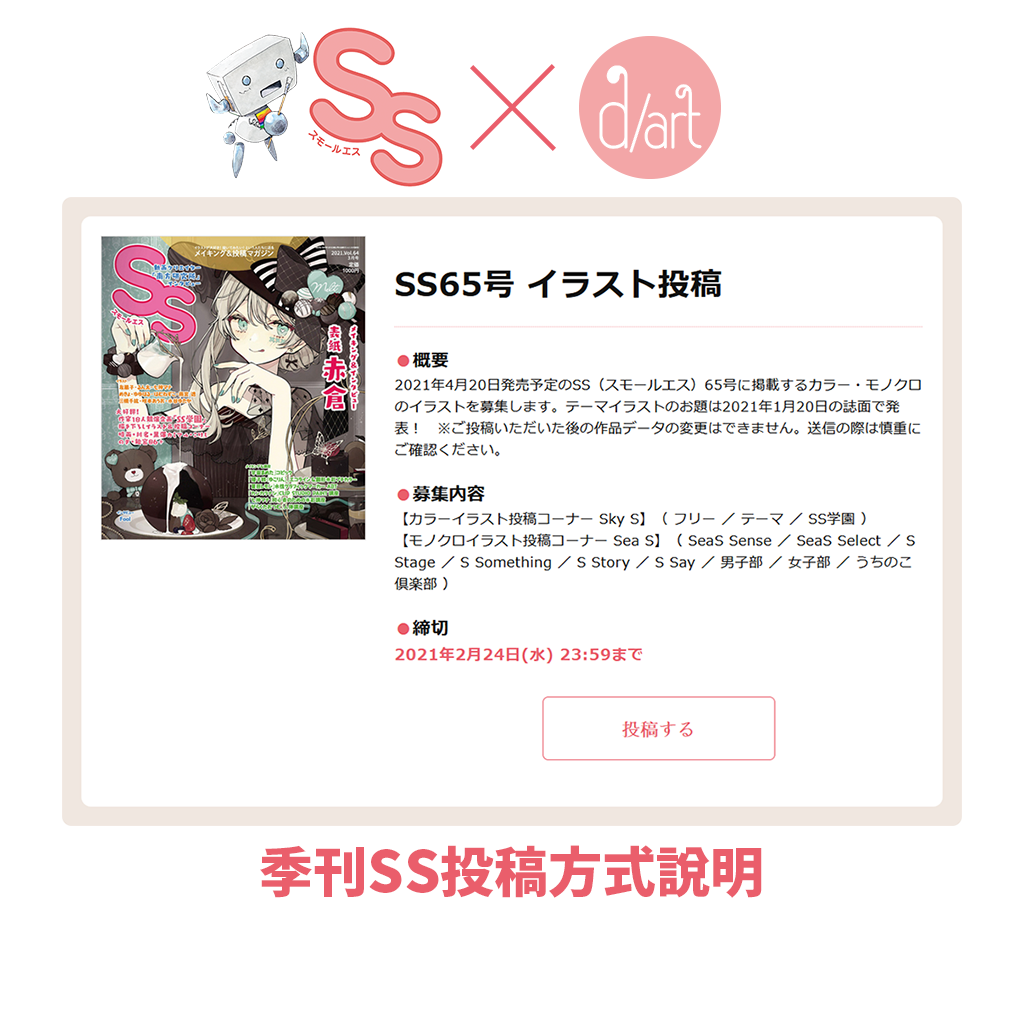 為了促進日台創作交流,季刊 SS 與 畫廊 d/art taipei 進行徵件展合作!季刊 SS x d/art taipei 聯名合作募集作品,將募集刊載在季刊 SS vol.65,並且刊載作品將於台北西門町 畫廊 d/art taipei進行展出!