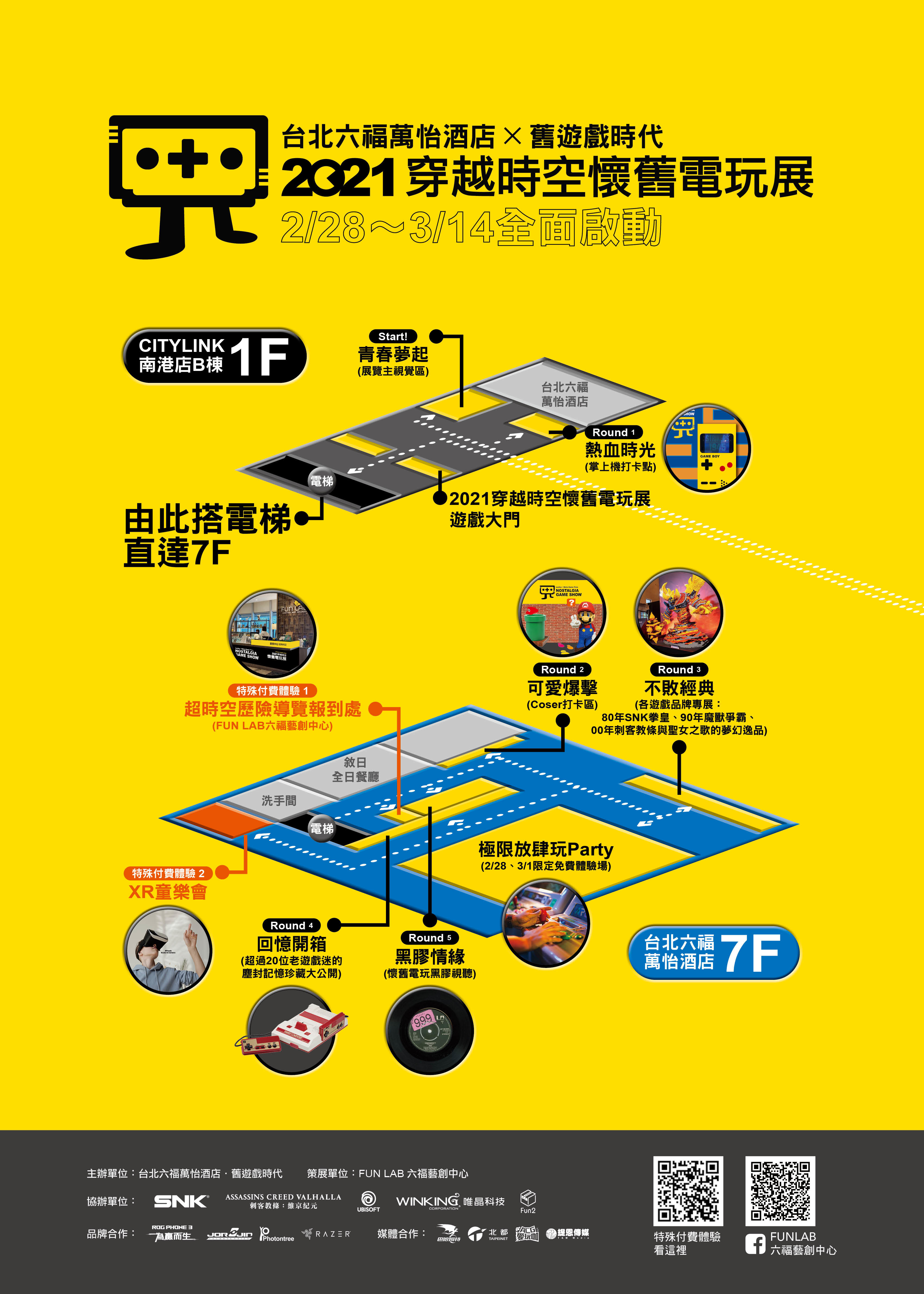 台北六福萬怡酒店與舊遊戲時代 228 連假推出的「2021 穿越時空 — 懷舊電玩展」,由 FUN LAB 六福藝創中心總策畫,以創新媒合平台理念出發,串接國內外知名代表性遊戲品牌:SNK、Ubisoft、唯晶科技,規劃五大展區共四大闖關遊戲,由專人帶領消費者重溫《拳皇》、《魔獸》系列、《