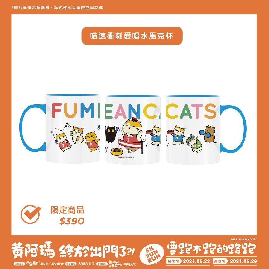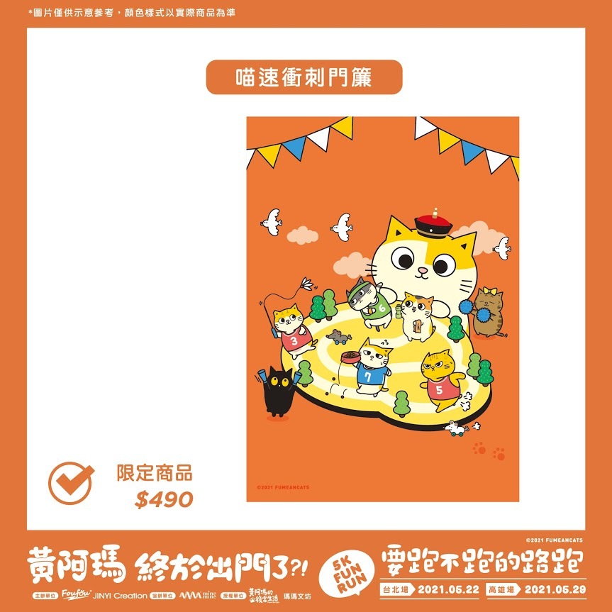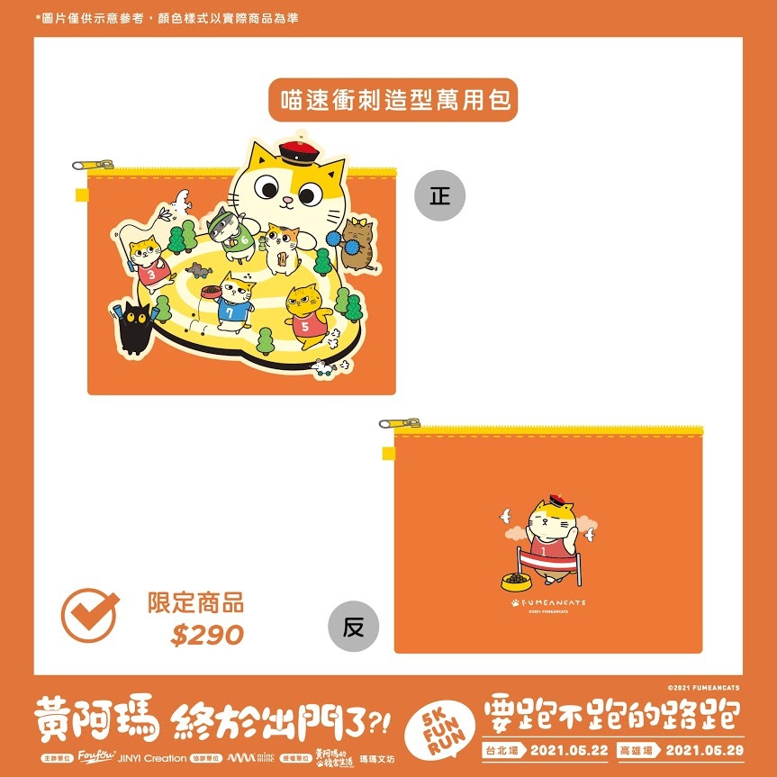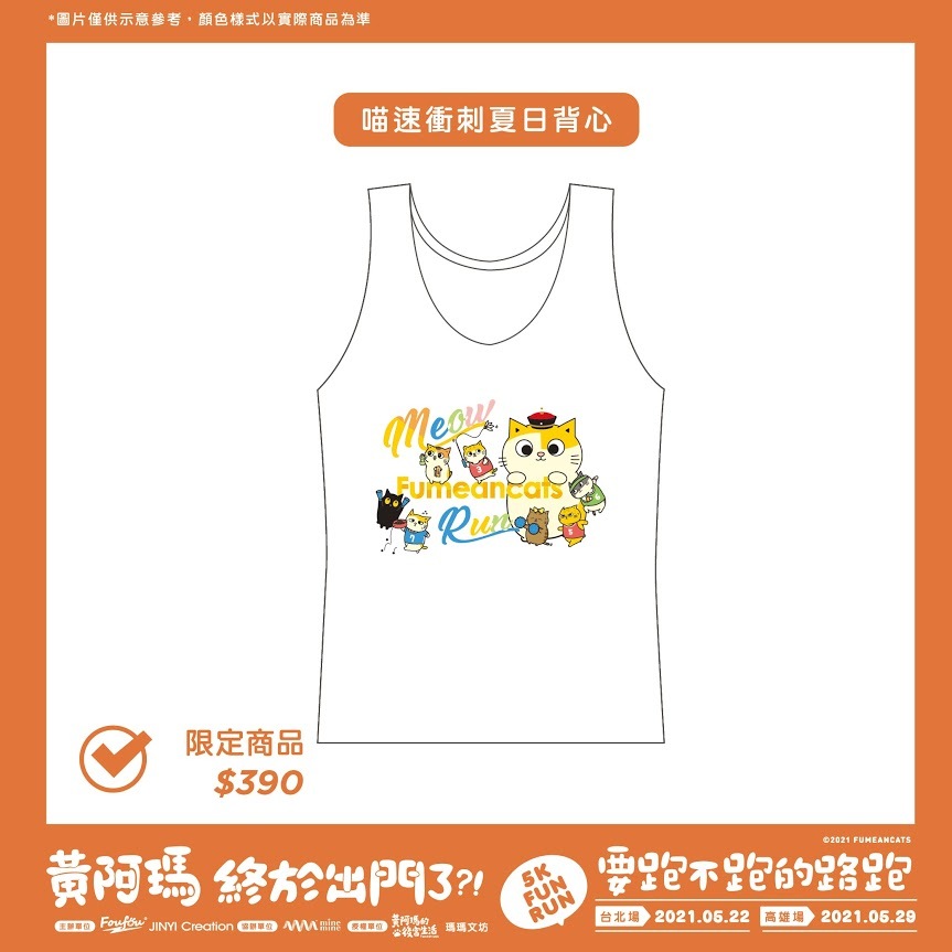 本次路跑活動推出兩種路跑包,有「輕便開跑組」(980 元)和「不怕太陽曬組」(1380 元)兩種,物資包含路跑T恤、紋身貼紙、喵速衝刺前開拉鍊束口袋、雙面漁夫帽、萬用頭巾、托特後背兩用包、冷水瓶等等,完賽禮則是阿瑪獎牌,都是報名路跑才能獲得的超稀有單品。