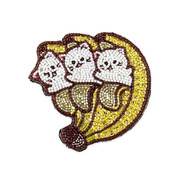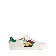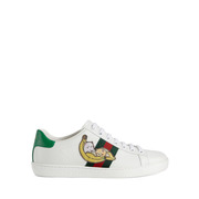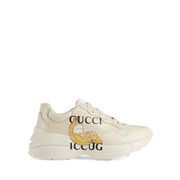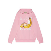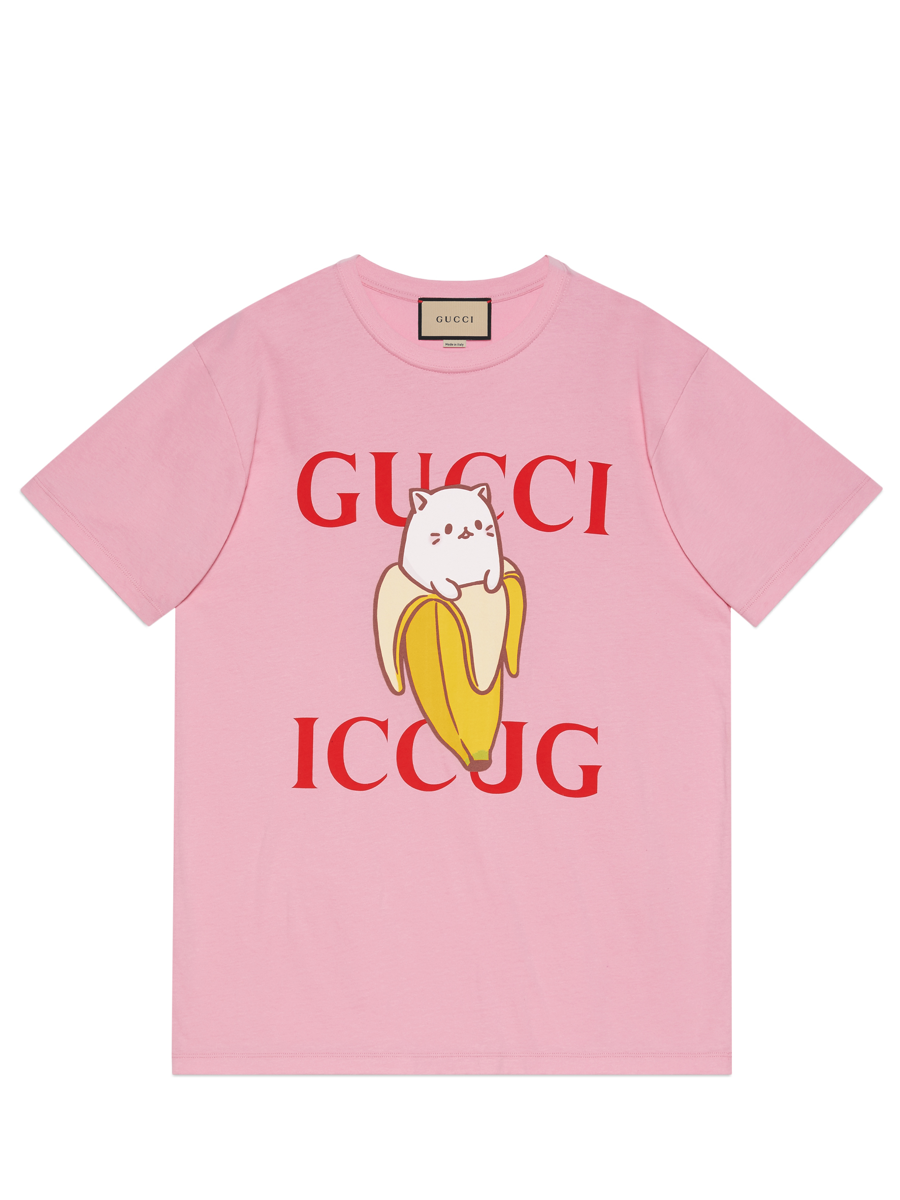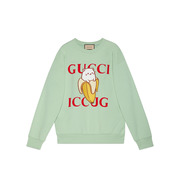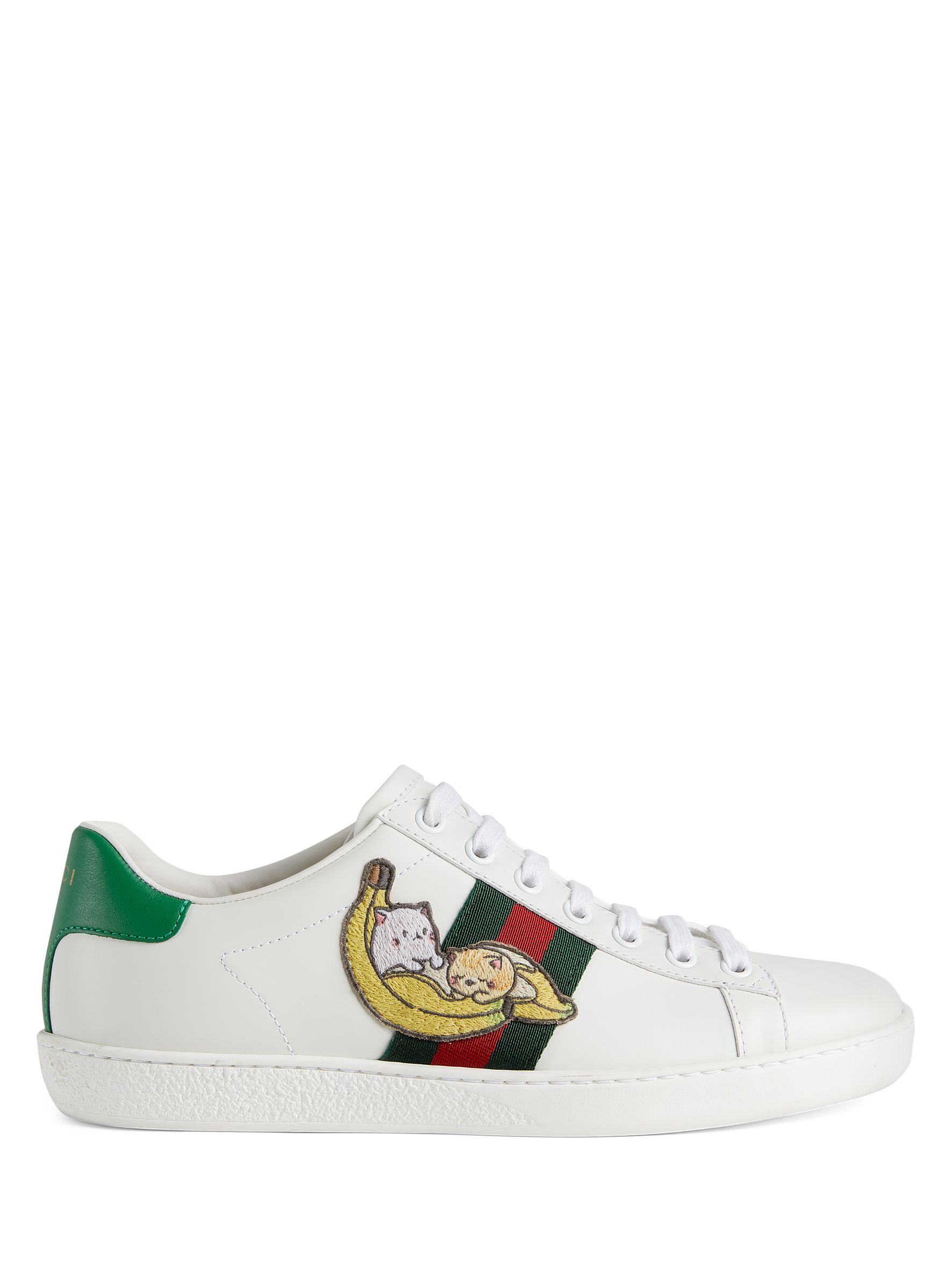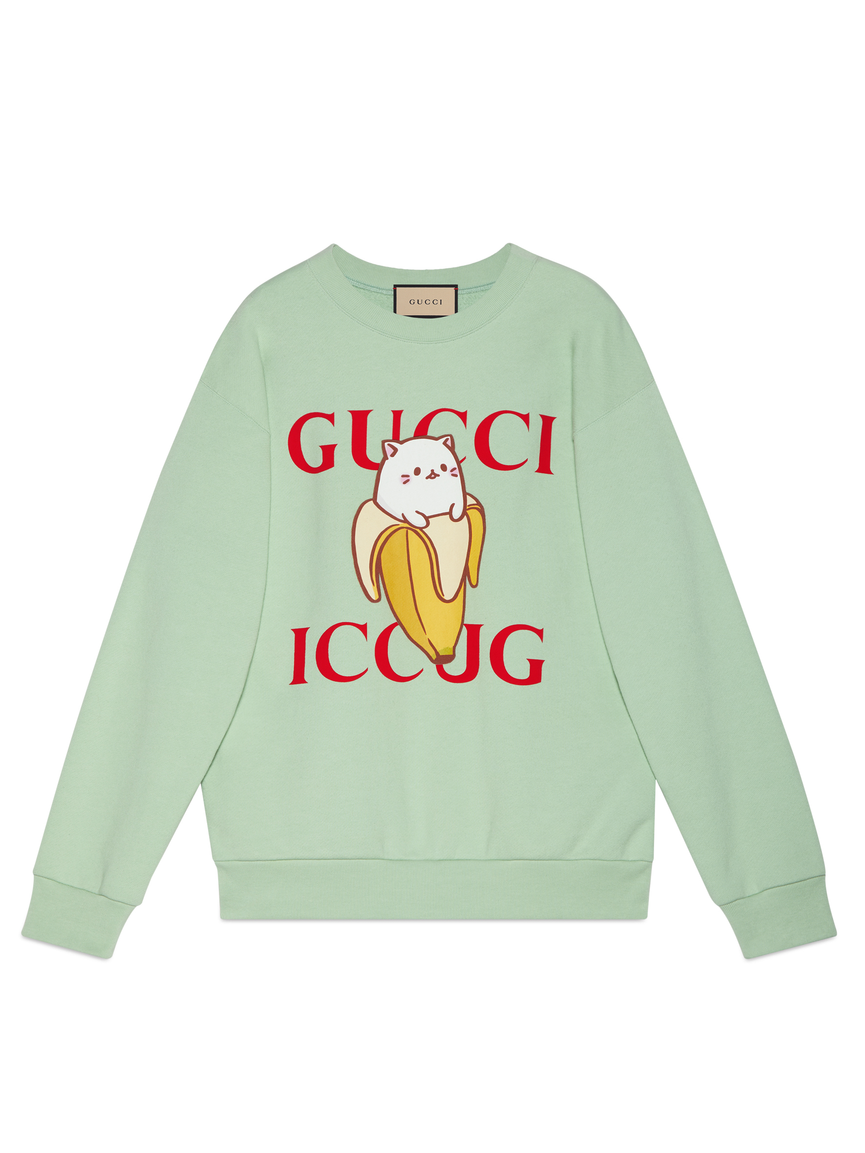 香蕉喵。 在運動鞋方面,男女款均有,在 Gucci 紅綠條紋之上裝飾著兩隻坐在香蕉裡的小貓。