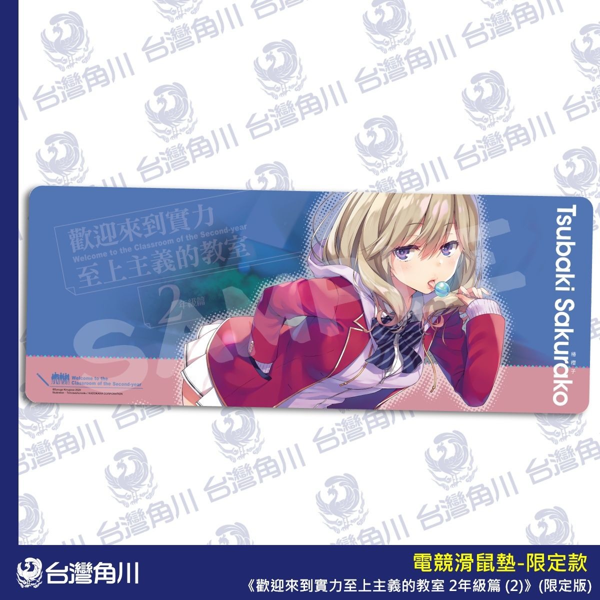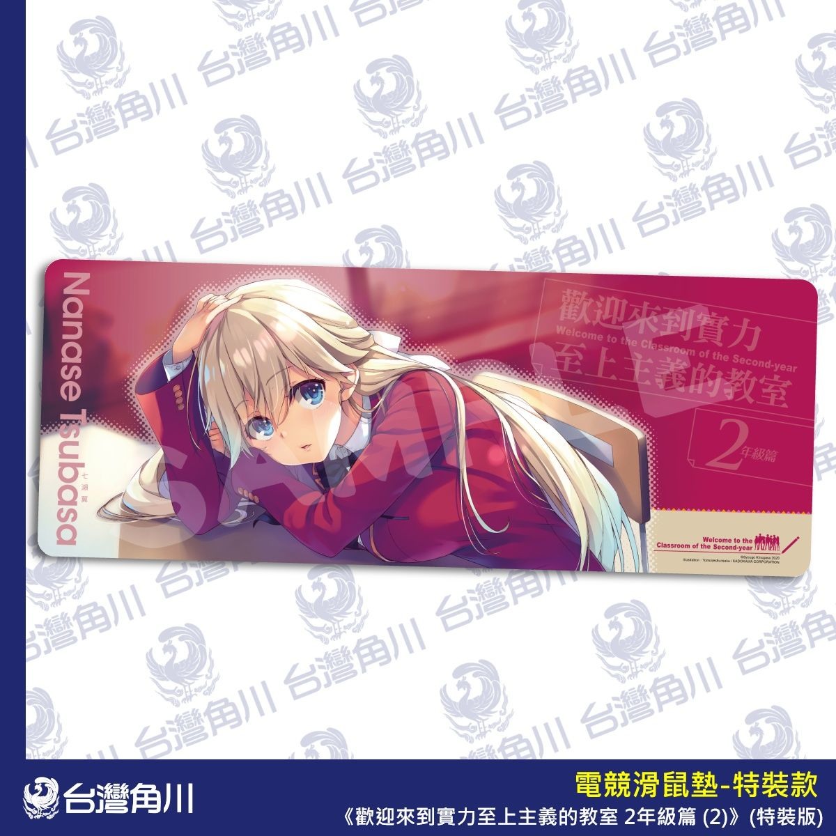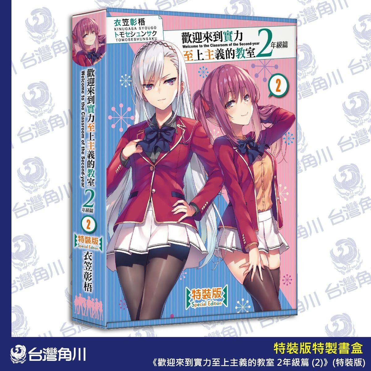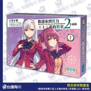 歡迎來到實力至上主義的教室 2 年級篇 (2)》特裝版及限定版,並於各大通路開放事前預購。【特裝版】收錄印有作者「衣笠彰梧」老師及插畫「トモセシュンサク」老師複製簽名的「壓克力桌繪」及七瀨翼款「電競滑鼠墊」,可透過全台實體店家或網路預購;【限定版】一樣收錄「複製簽名壓克力桌繪」,以及椿櫻子款「電競滑鼠墊」、「2 年級篇特製帆布提袋」,僅限於台灣角川官網獨家預購。以上兩款商品預購期間自即日起開放至 2021/6/11(五)17:00 截止。