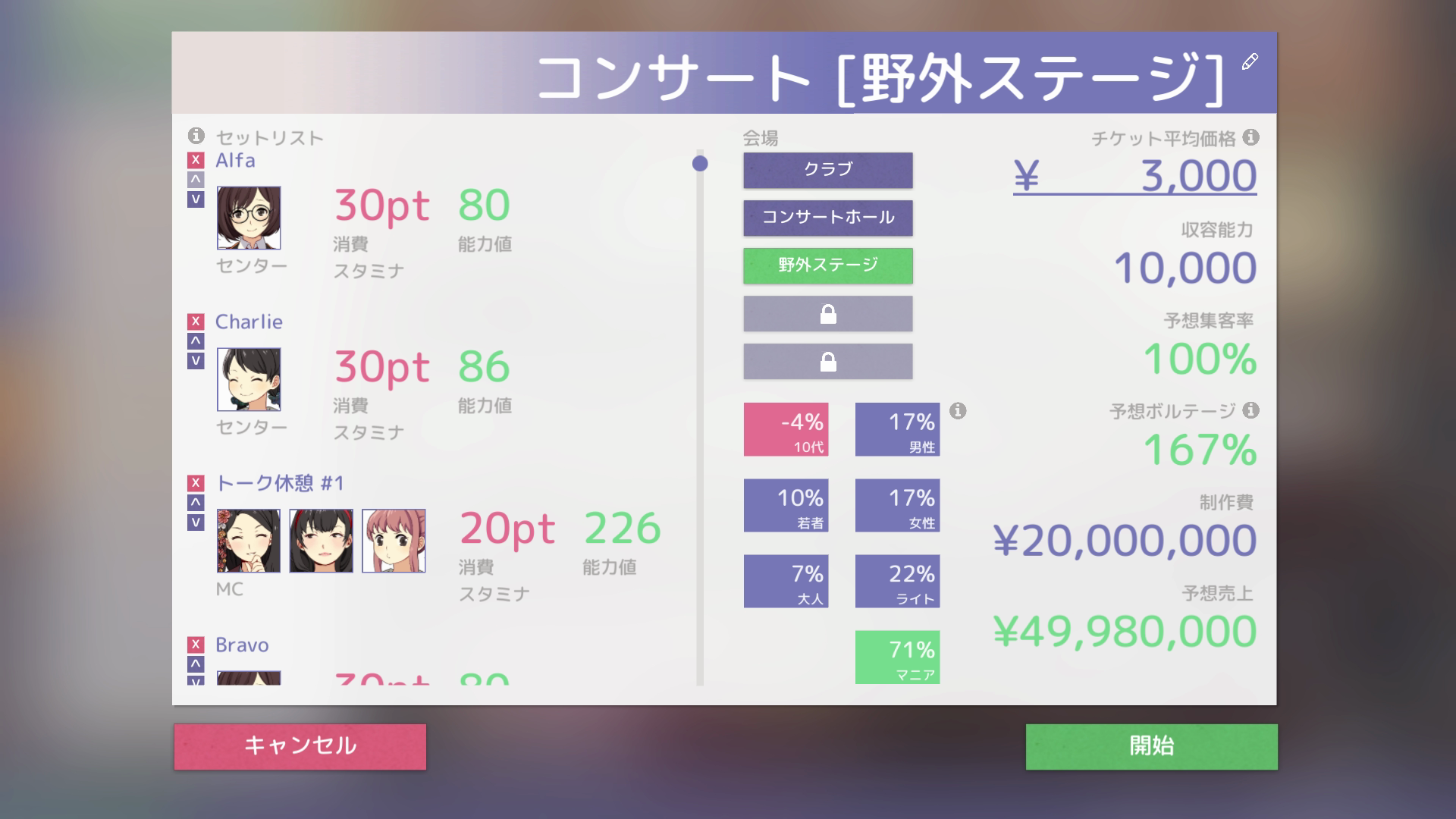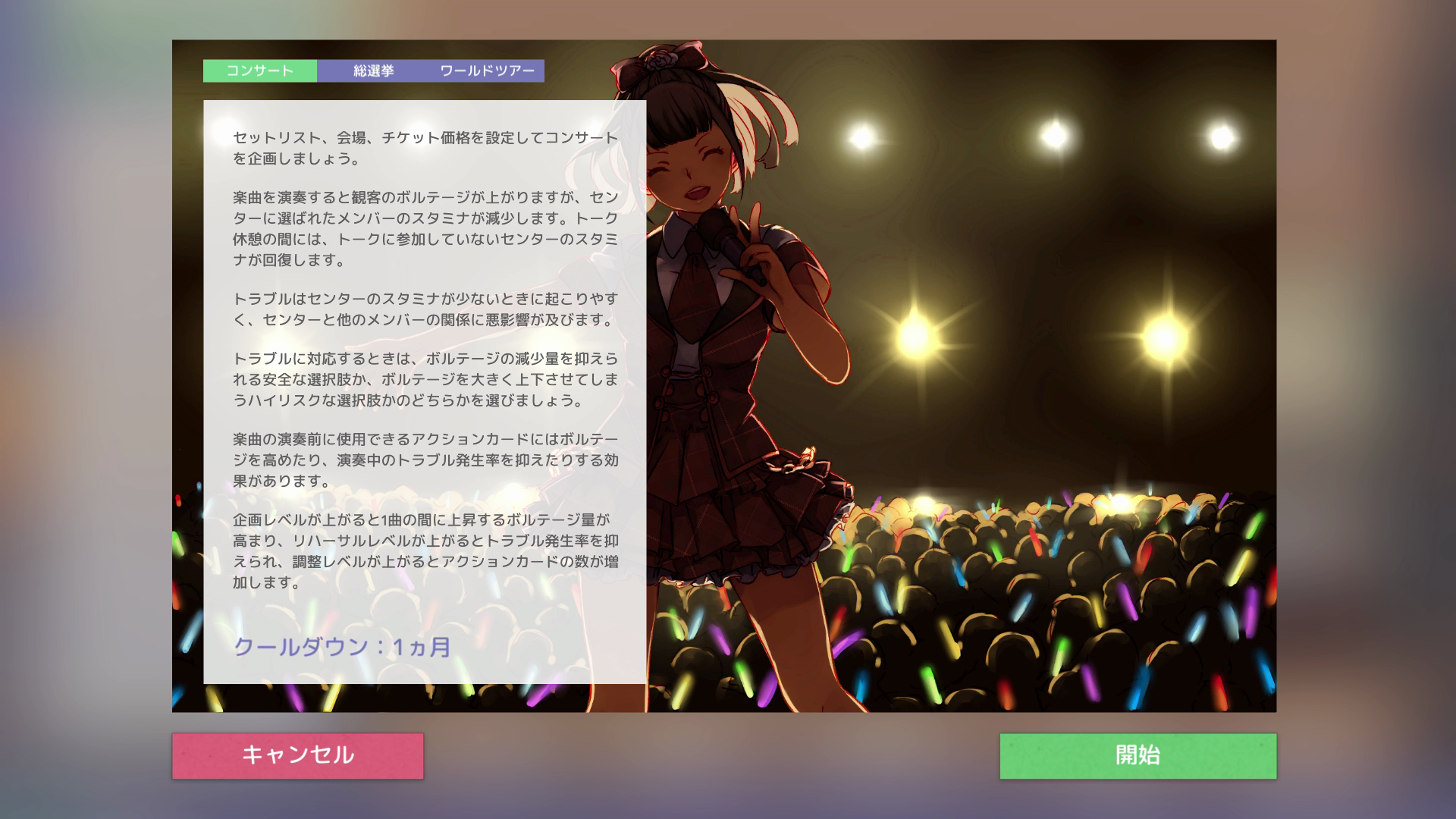 玩家可以在遊戲中透過製作單曲、舉辦音樂會、進行大型電視活動甚至海外活動,為偶像與公司帶來收入,而遊戲中會發生特別事件和故事支線。許多是由玩家遊戲進度來觸發,每個支線故事可能根據玩家的決定會有不同後果。