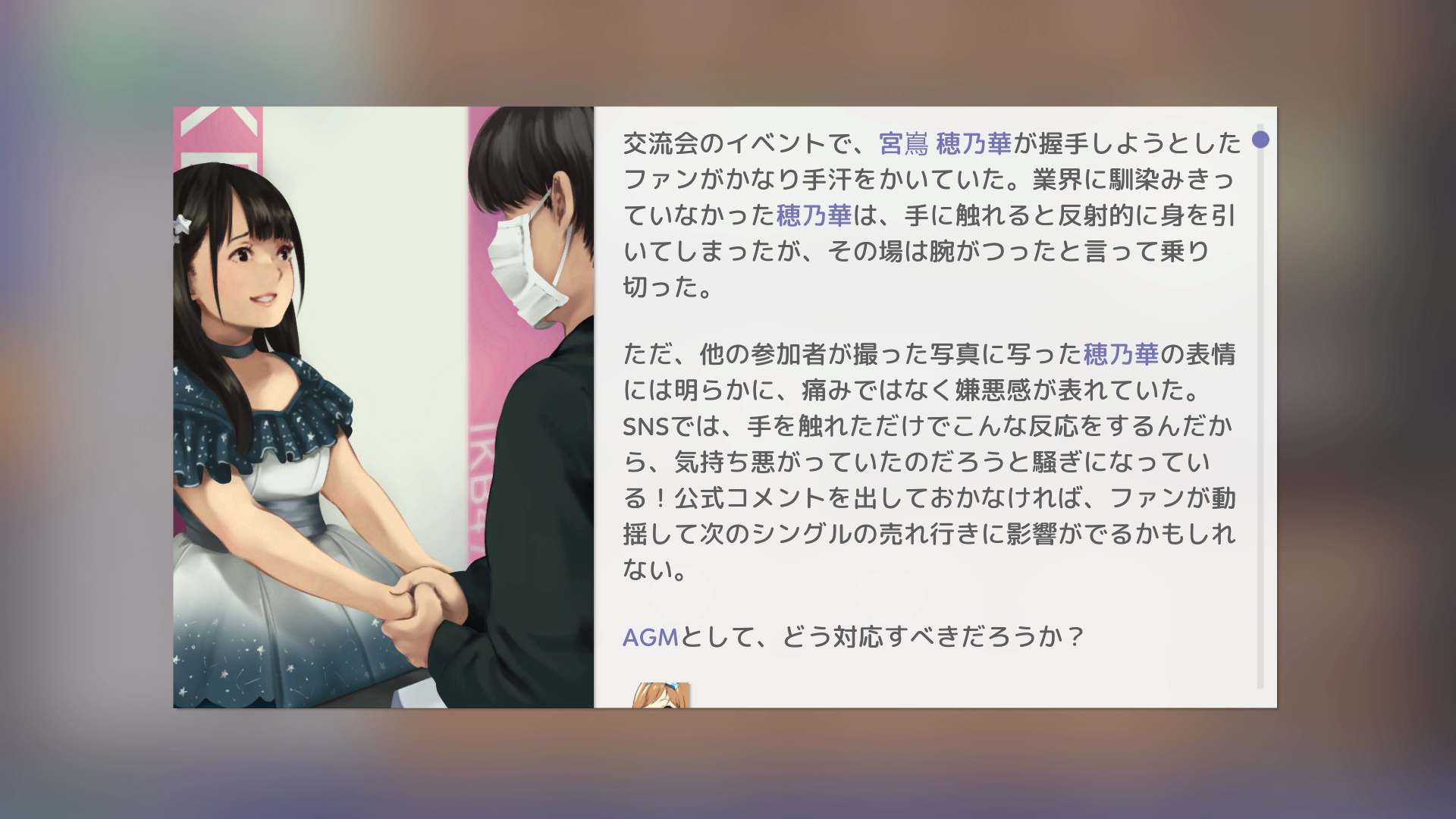 然而,玩家也得留意這些青春少女的私生活,成為流行偶像的生活並非總是幸福順遂,當她們鬧出不合、情緒崩潰或鬧出醜聞時,有可能帶給公司災難;此外,遊戲世界還有八卦雜誌狗仔、競爭者與超級粉絲等的危機,有的甚至會以骯髒手段來企圖對付你,以取得利益,為了維持公司的正常運作,玩家有時必須採取必要的反擊手段。