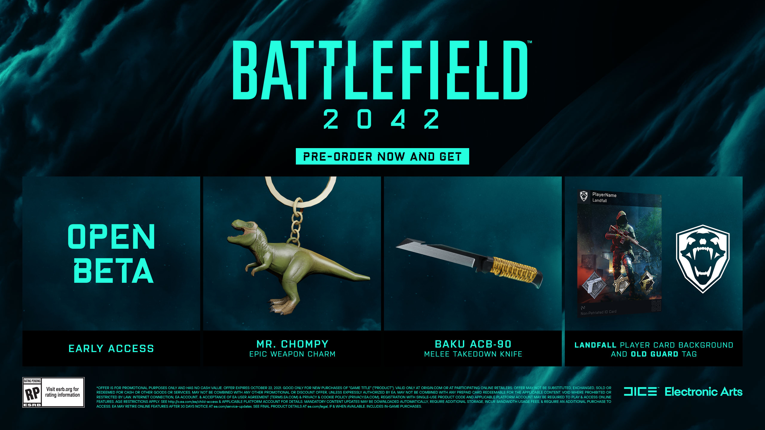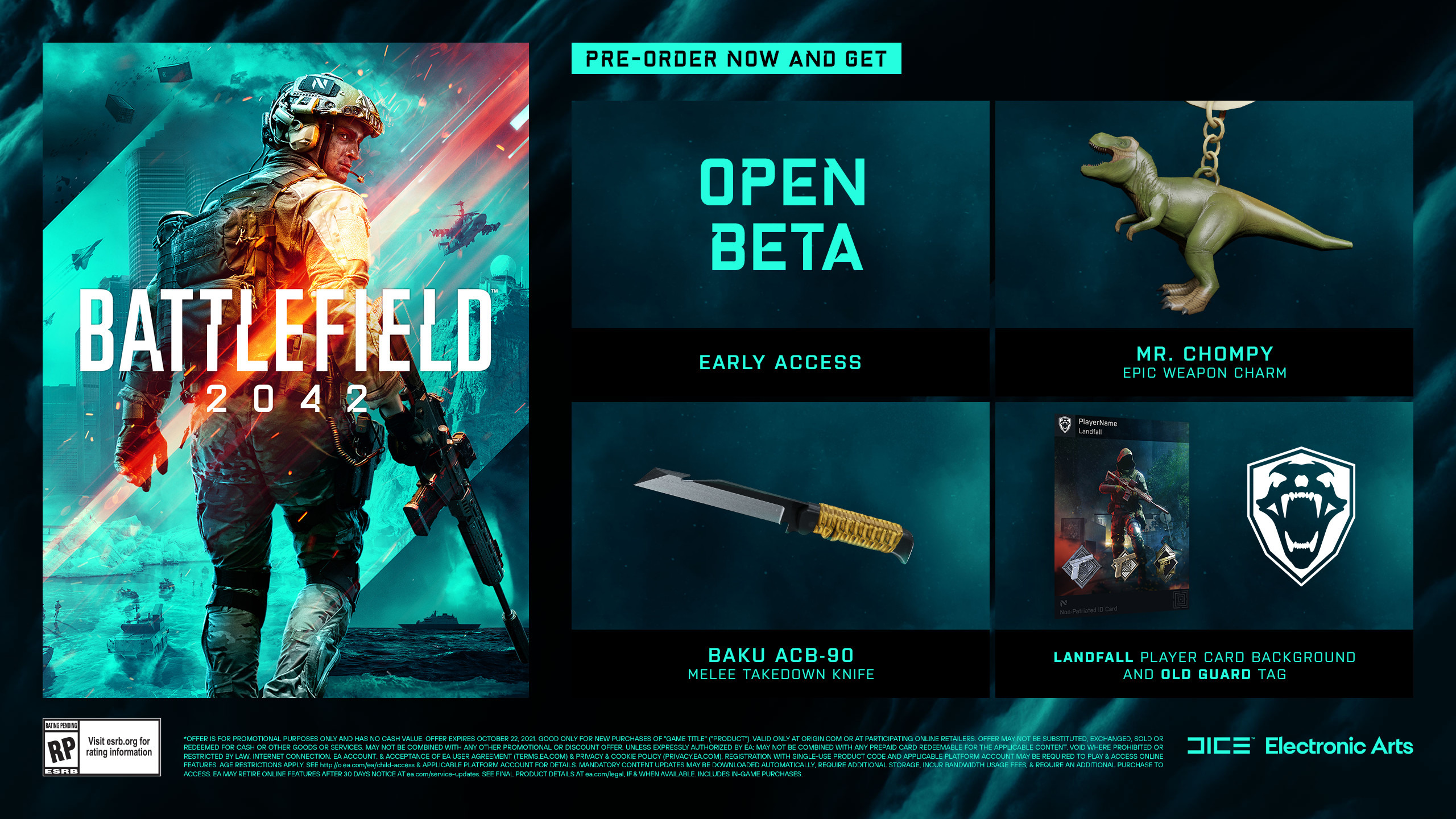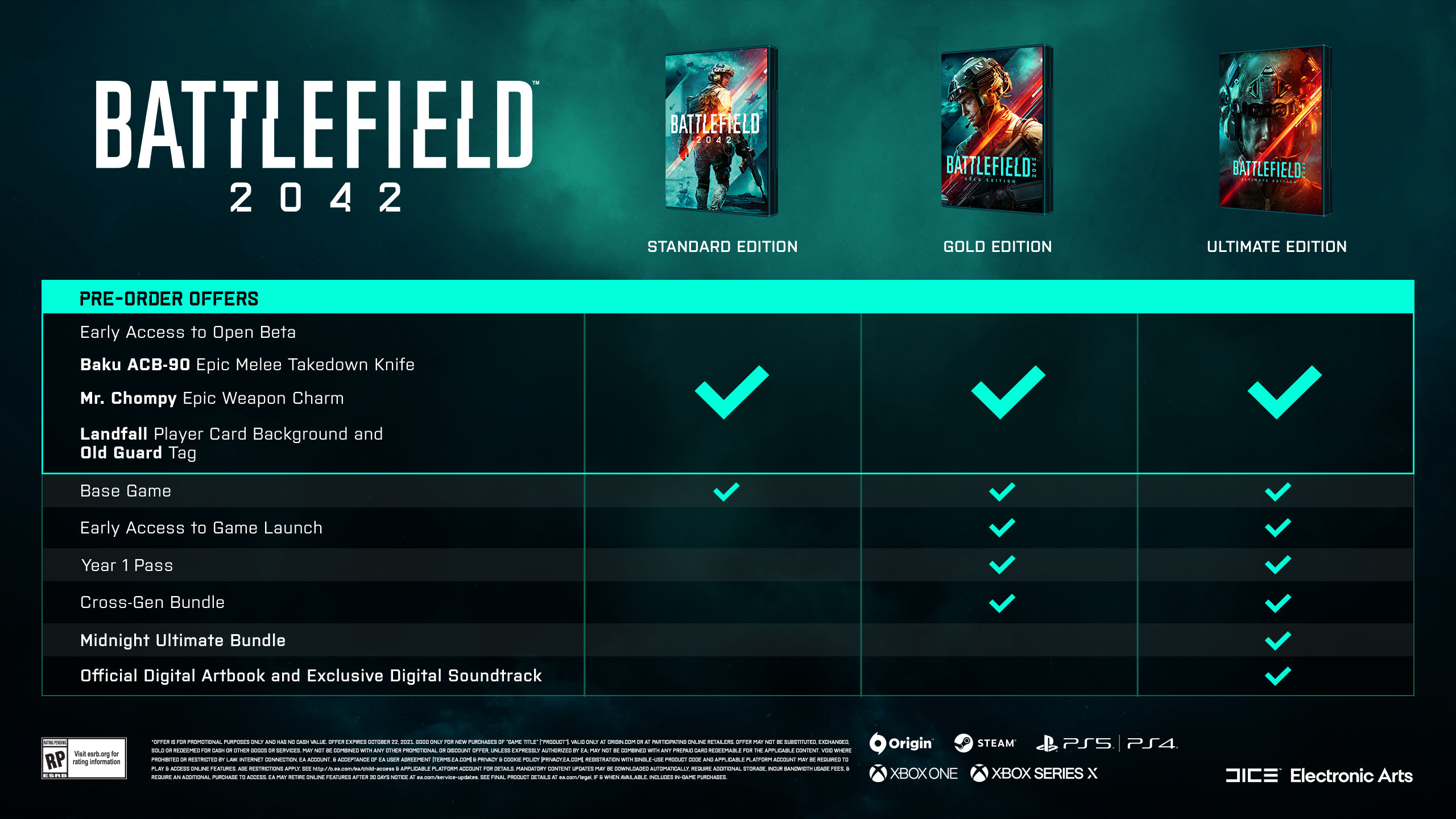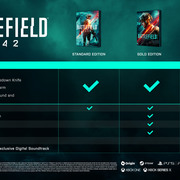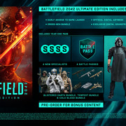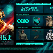 戰地風雲 2042》現已開放預購,預定 10 月 22 日於零售店和數位商店發行。Xbox One、PS4、PC 版售價 59.99 美元,Xbox Series X|S 和 PS5 版售價 69.99 美元。黃金版 PC 版售價 89.99 美元,家用主機版售價 99.99 美元,終極版 PC 版售價 109.99 美元,家用主機版售價 119.99 美元。預購可獲得公測資格。