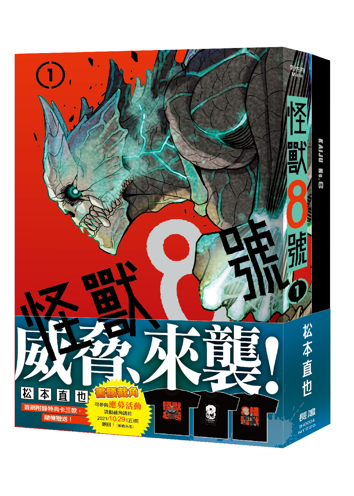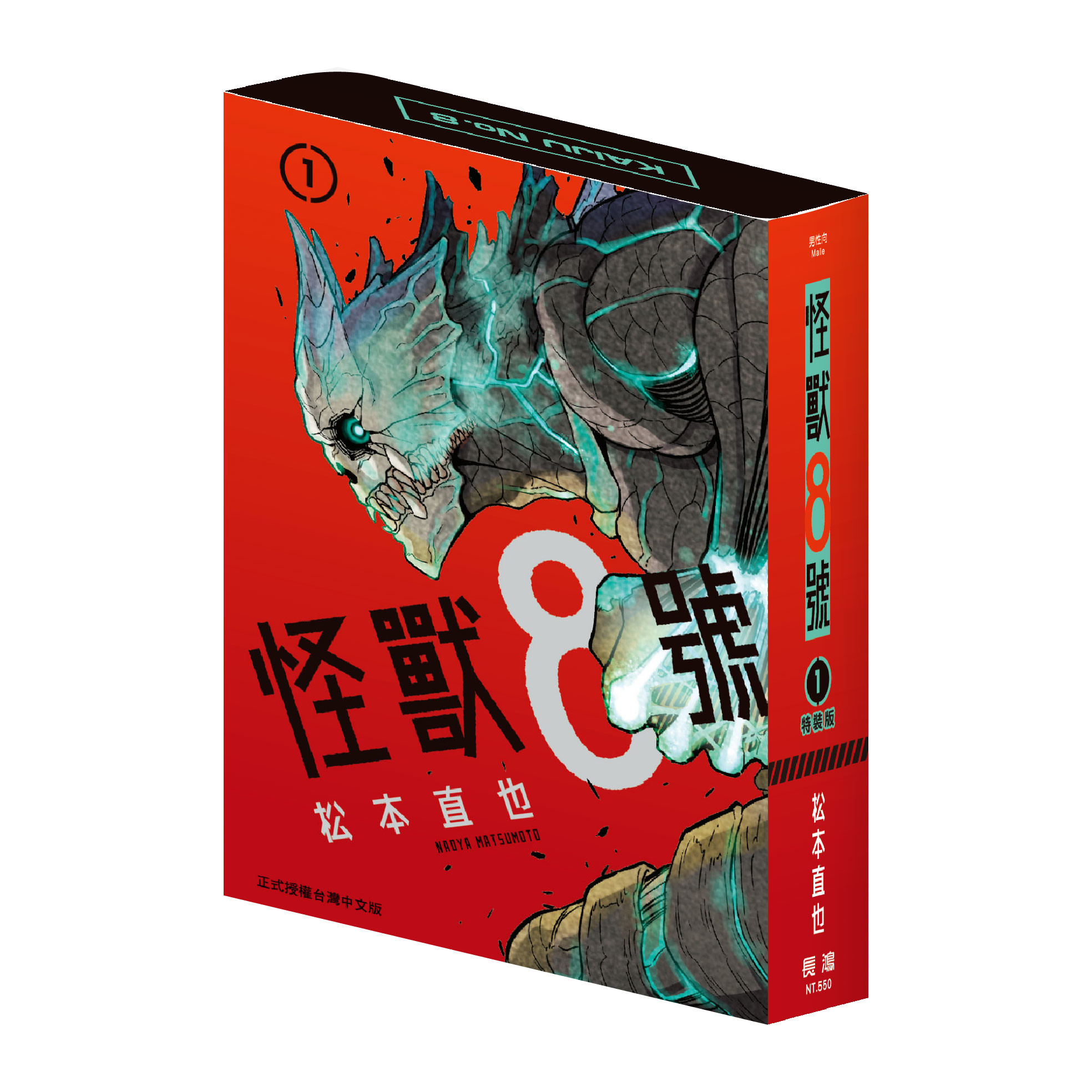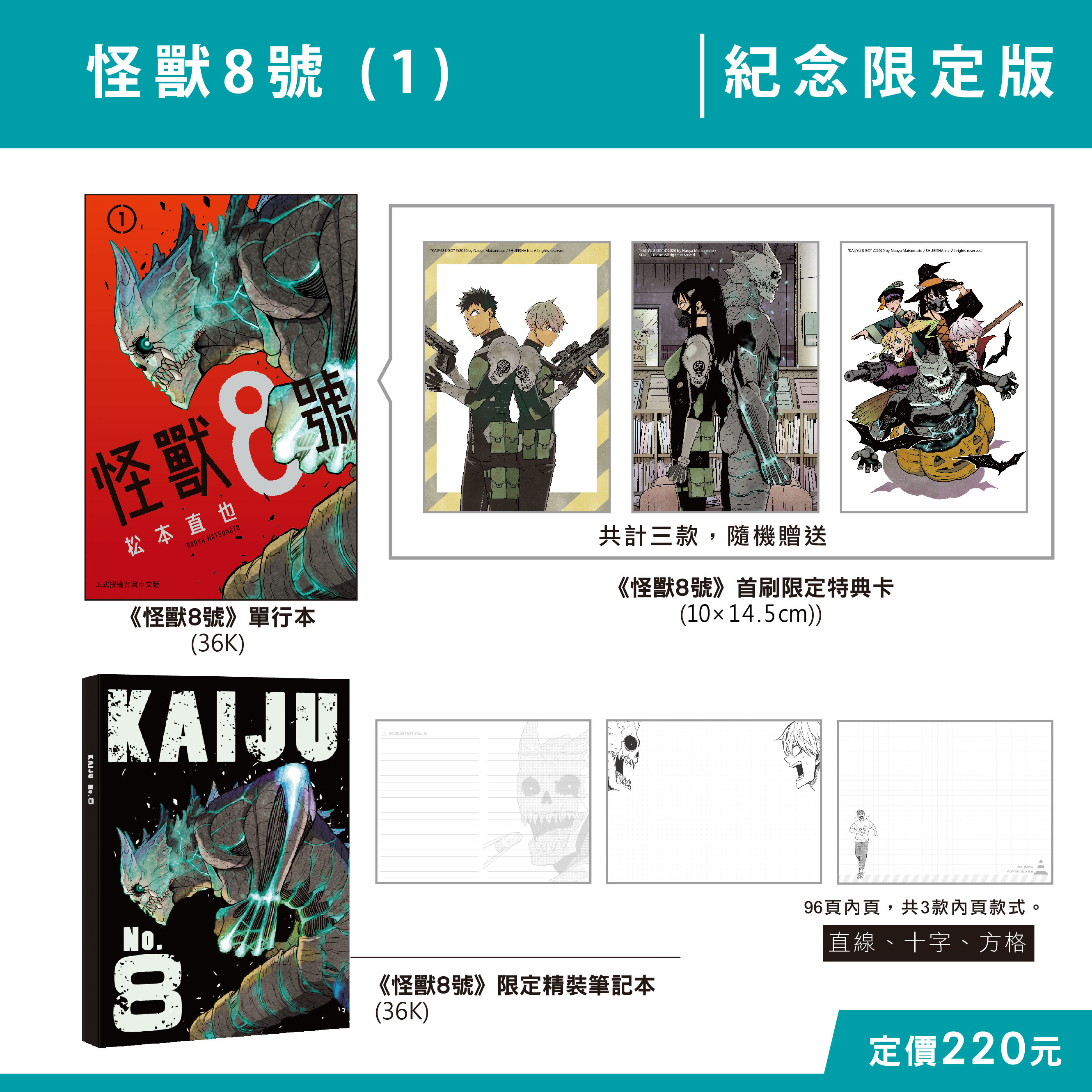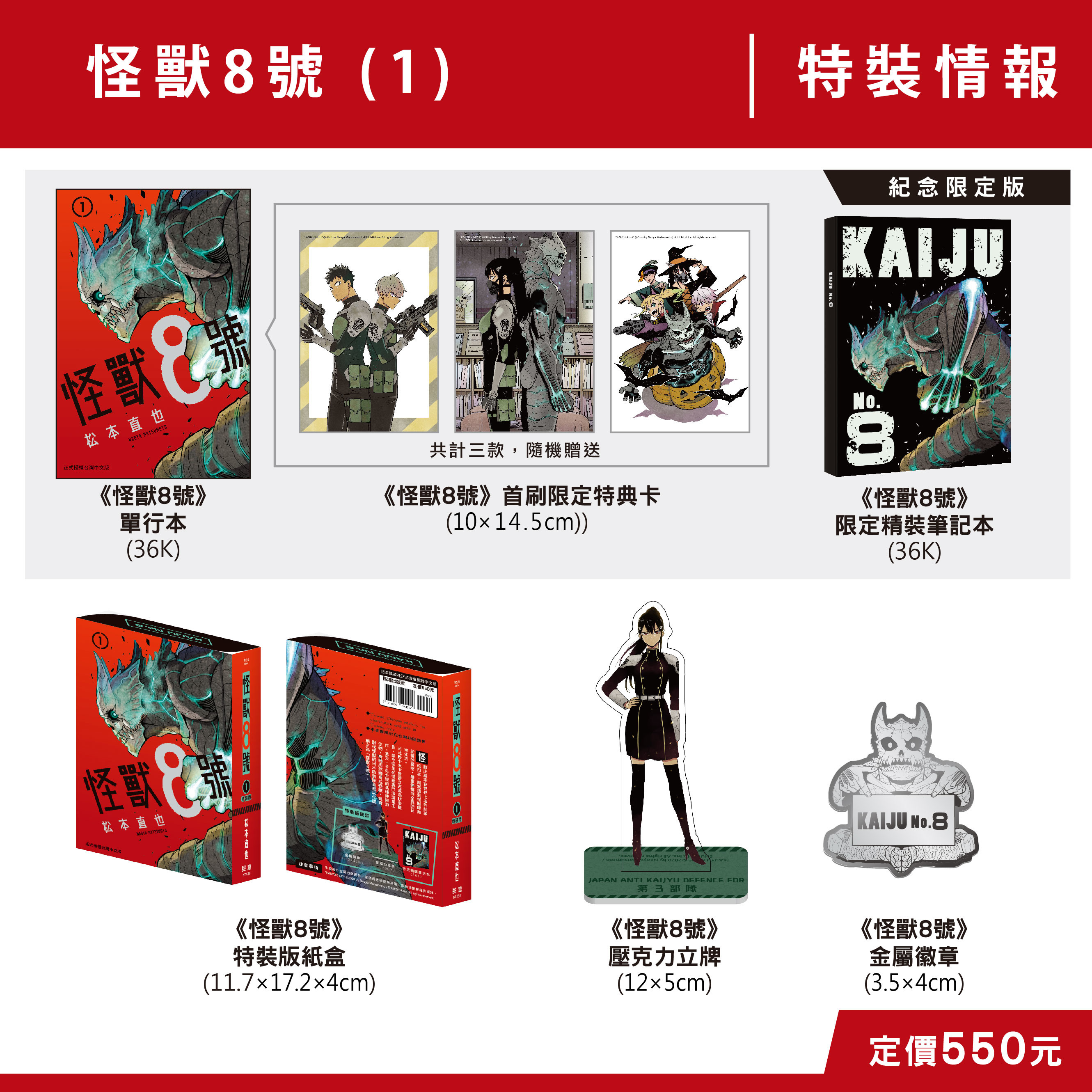 怪獸 8 號》第一集在台上市,長鴻本次更精心推出了「紀念限定版」,內含單行本與精裝筆記本。筆記本內有三款趣味的內頁設計外,書封部分採用特別印刷方式來呈現金屬質感,與怪獸的光束感。