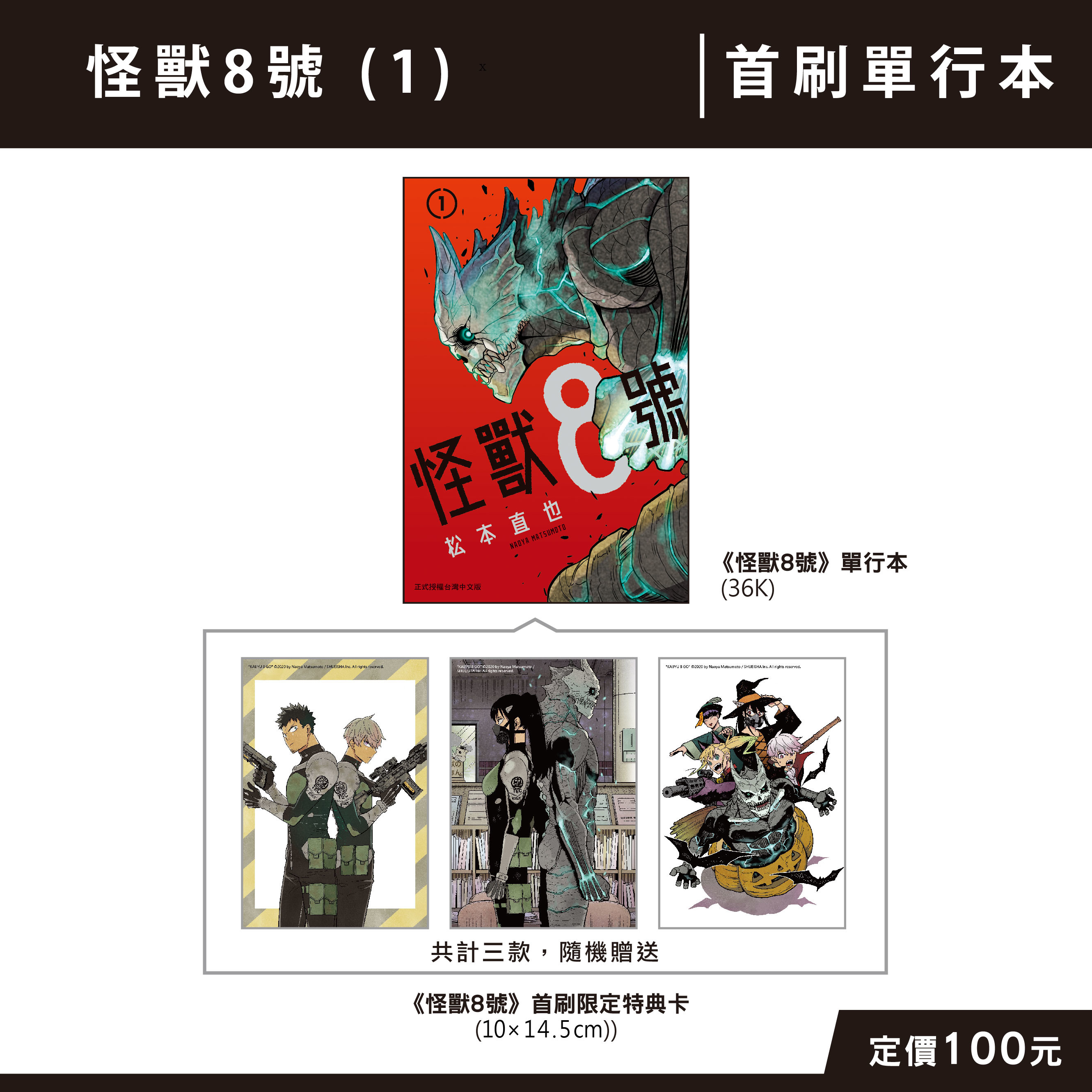 怪獸 8 號》第一集隆重登台,本次單行本的首刷附錄特典卡,特別推出三種款式,隨機贈送乙張。