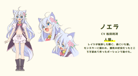 人狼人娘諾耶拉,白髮獸耳小蘿莉,人型獸化兩相宜,純淨天真的性格、毛茸茸的大尾巴,包括纏著禮治撒嬌的嬌憨模樣或是抗議自己是狼不是獸人的氣噗噗小肉包臉都很可愛,可以說故事主要內容之一就是來看諾耶拉怎麼萌殺讀者。