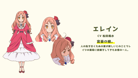 從較有衝擊性的能量藥水開始到除臭劑,第一話就塞入三個藥品製作,稍微有點趕進度的嫌疑,不過敘事還算通順。畫面方面從直接的印象來說,人物整體的形象與小說插圖、漫畫版相比角色的外觀年紀有更下修幼齡化的趨勢。明亮的暖色系調適,加上諾耶拉不時出來跑跑跳跳甩甩尾巴,讓作品有著充滿活力的樂天感。不過人物的構圖幾個轉鏡之間略有點崩還是很容易看出的小缺點。