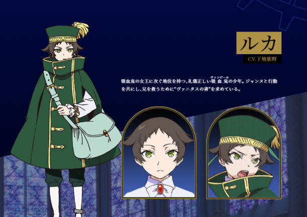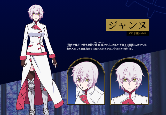 做為第二主角的諾亞,像深山出來的孩子一樣,單純的為所有沒看過的事情感到興奮,對複雜的事情或許會迷惘或許會躊躇,但總有辦法找到自己找到自己的道理率直地往前進。還有唯我獨尊的教會聖騎士羅蘭、氣場強烈的吸血鬼大公魯斯文卿、當家花旦「業火魔女」貞德。各角色之間的價值觀對撞構成本作獨特的魅力所在。再加上吸血鬼們必然的帶有各種暗示性的擁吻場景,產生出唯美又帶魅惑的化學效應。
