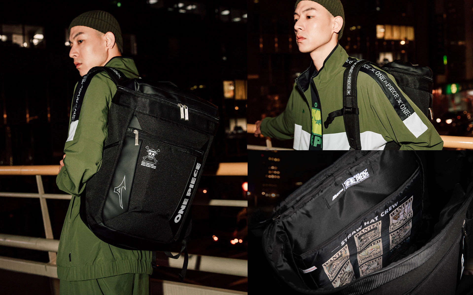 用品設計則以簡約實用為主軸,外在不裝飾過多的動漫元素,而是將這些細節藏在內層,讓購買的粉絲們細細品味。運動背包以百搭的黑色風格為主,外表看似單純的設計,卻在打開後讓人驚豔,映入眼簾的是草帽海賊團一行人的懸賞通緝單,排放順序更是具有巧思地依照劇情登場先後(定價 NT$ 2,780)。棉帽則以繡有 MIZUNO 與 ONE PIECE 的特別骷髏標為賣點,平易近人的價格與休閒百搭的外型(定價 NT$ 680)。