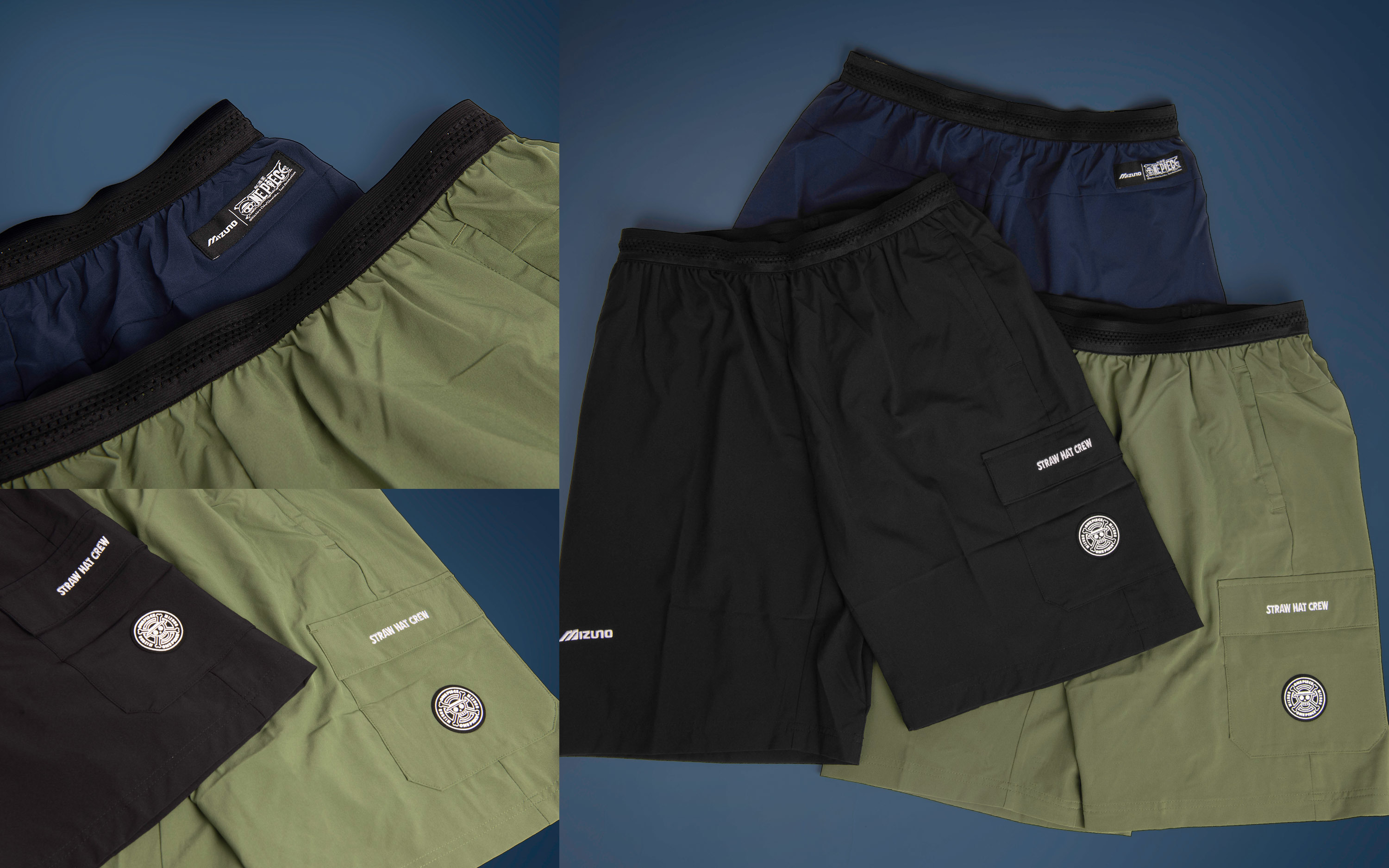 本次服裝設計圍繞在三位主角魯夫、索隆、香吉士身上,在服裝上加入各角色的代表符號。平織外套在兩袖印有明顯的「ONE PIECE」昇華印,胸口部分也有著角色名稱刺繡,提升整體質感(定價 NT$ 2,580)。在材質部分,UPF50 的伸縮彈性布料以及後背部透氣設計,即便是在夏日也是輕薄穿搭的好選擇。印花 T 恤以人物圖案的大片印刷為賣點。此外,咖啡紗材質的選用,具有排汗速乾與消臭的功能,相當適合夏天的穿搭(定價 NT$ 1,080)。棉 T 則鎖定喜好低調設計的粉絲,以角色們個別的專屬刺繡,以及袖口 MIZUNO 印花色的搭配,低調呈現自己最喜歡的角色(定價 NT$ 1,180)。短褲以繡有草帽海賊團「STRAW HAT CREW」的英文,以及 MIZUNO 與 ONE PIECE 的特別骷髏標設計(定價 NT$ 1,280)。
