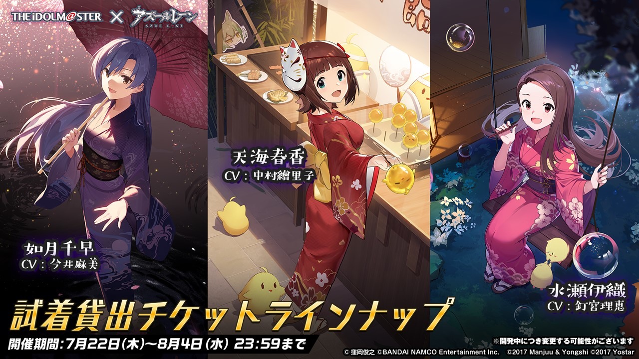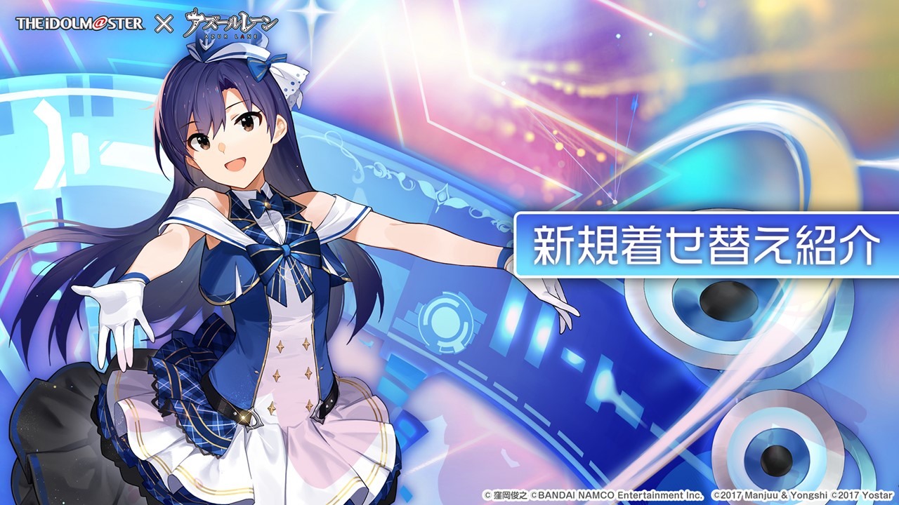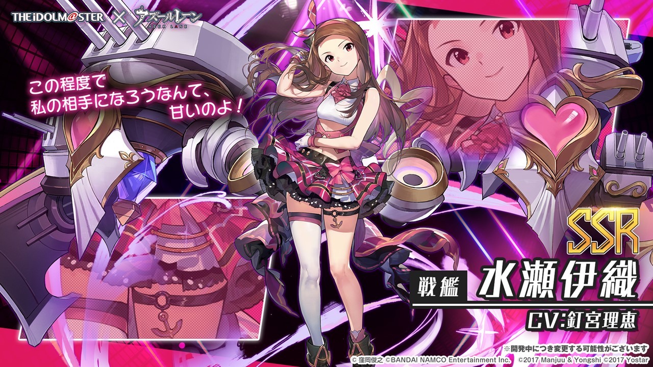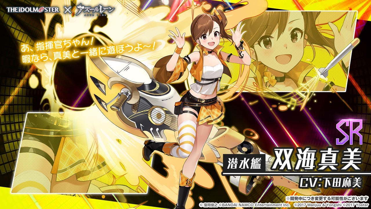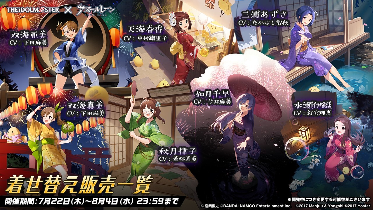 此次合作登場的角色包括 SSR 輕巡洋艦「天海春香」(CV:中村繪里子),SSR 空母「如月千早」(CV:今井麻美),SSR 重巡洋艦「三浦梓」(CV:たかはし智秋),SSR 戰艦「水瀬伊織」(CV:釘宮理恵),SR 運送艦「秋月律子」(CV:若林直美),SR 潛水艦「双海亜美・真美」(CV:下田麻美)共計 7 名。