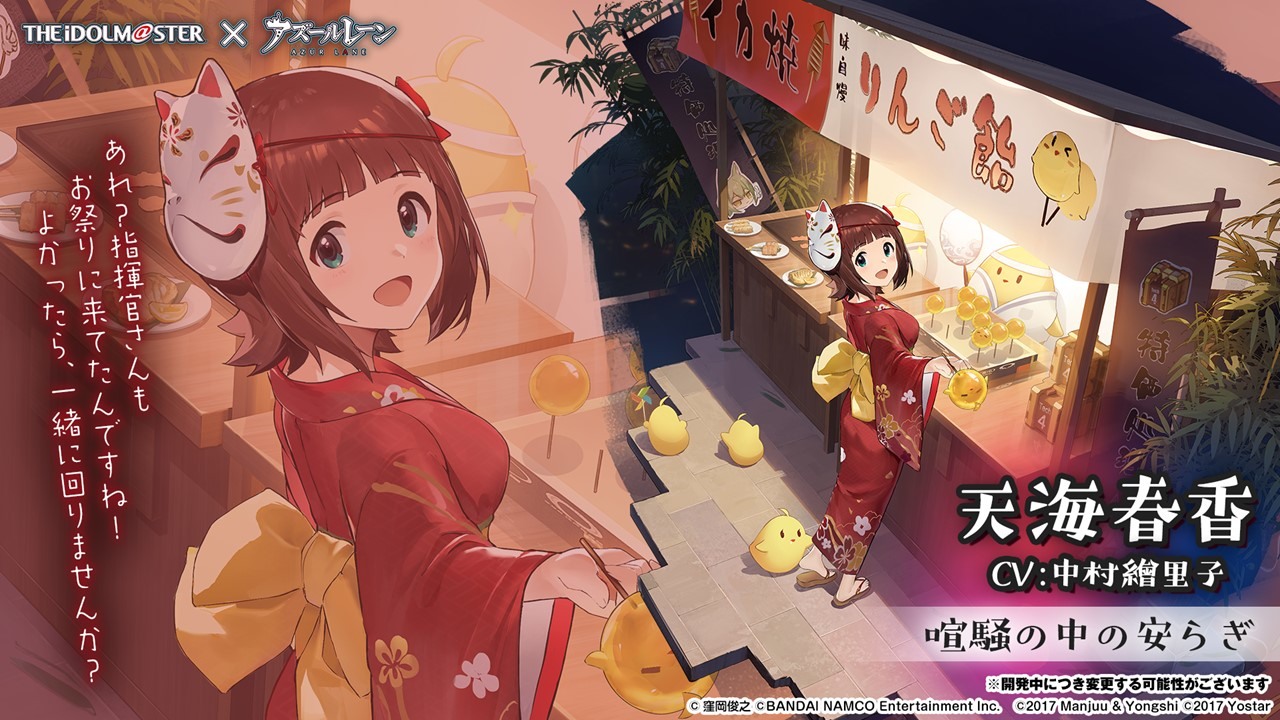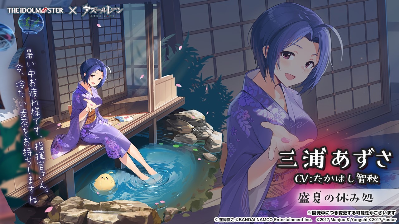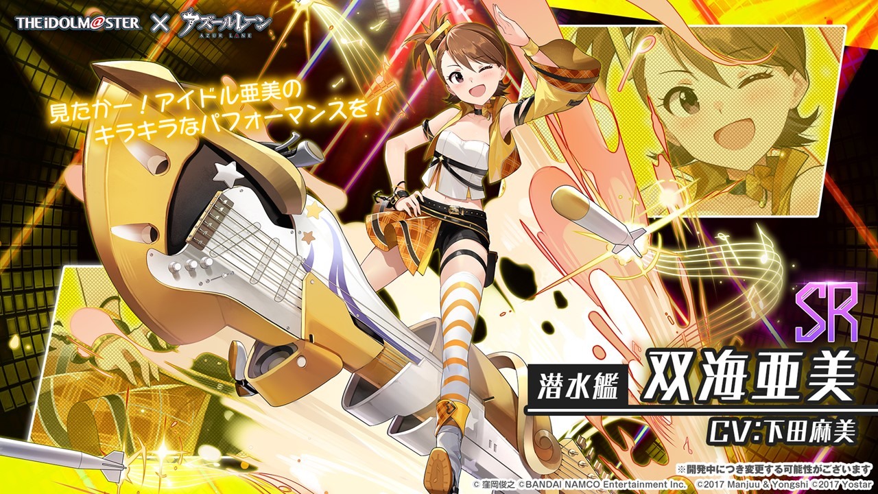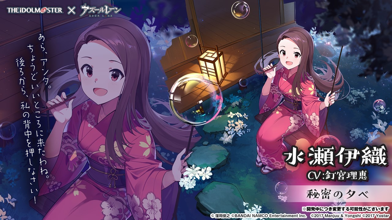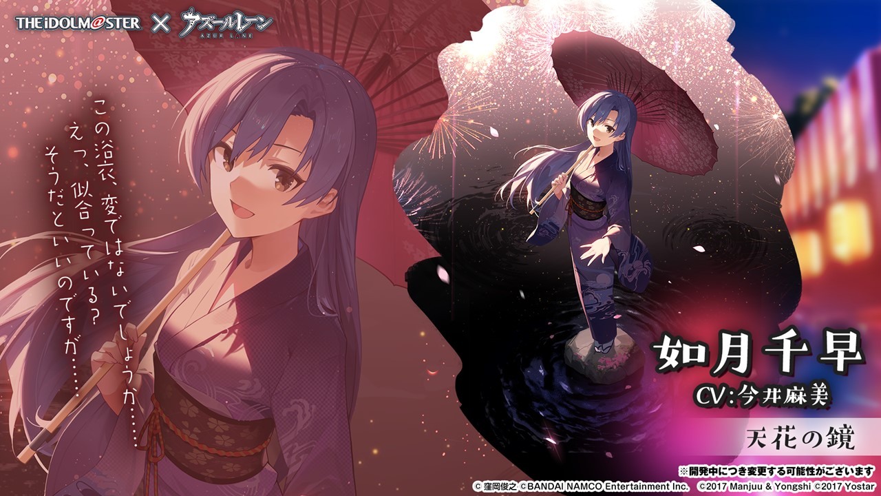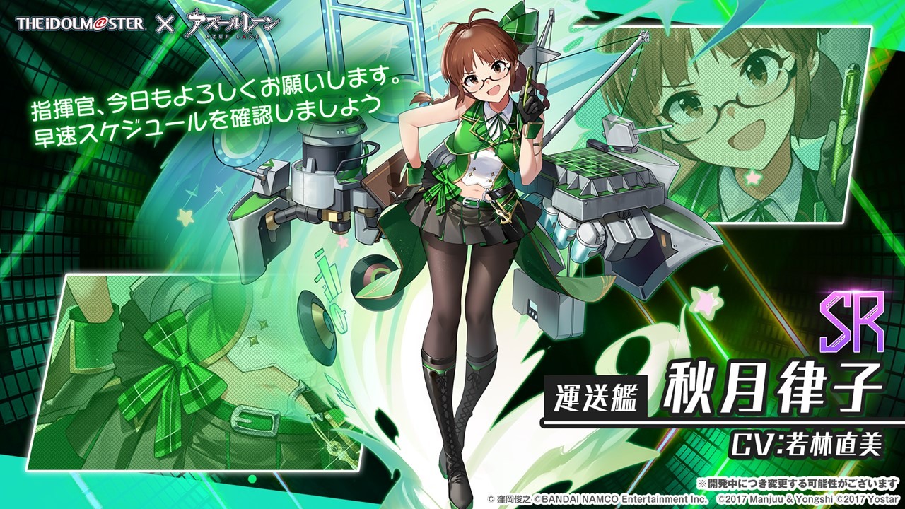 此次合作登場的角色包括 SSR 輕巡洋艦「天海春香」(CV:中村繪里子),SSR 空母「如月千早」(CV:今井麻美),SSR 重巡洋艦「三浦梓」(CV:たかはし智秋),SSR 戰艦「水瀬伊織」(CV:釘宮理恵),SR 運送艦「秋月律子」(CV:若林直美),SR 潛水艦「双海亜美・真美」(CV:下田麻美)共計 7 名。