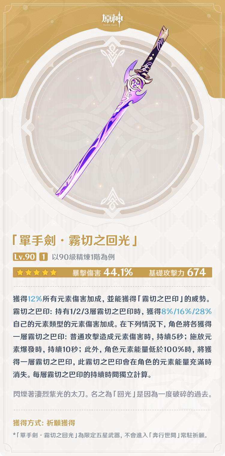 活動期間,限定五星武器「單手劍·霧切之回光」、五星武器「長柄武器·天空之脊」的祈願抽取祈願抽取機率將大幅提升。