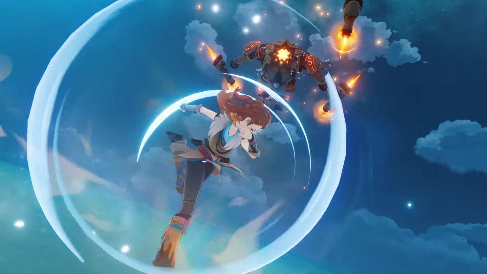 地平線:期待黎明》的聯動中,亞蘿伊將作為全新五星角色「異界的救世主」加入狩獵,與旅行者一同探索更多提瓦特的秘密。來到提瓦特的亞蘿伊同樣能隨時為正當之事挽弓放箭,她不僅擁有高超的箭術,還獲得了冰屬性的神之眼,能在戰鬥和探索中使用獨特的元素力量。