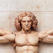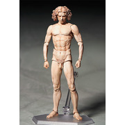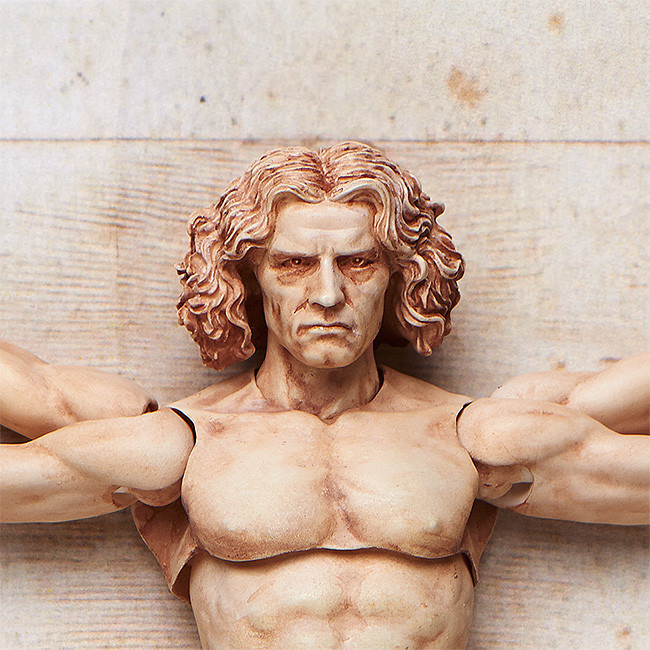 「桌上美術館」系列第五彈,世紀天才李奧納多‧達文西所描繪的「維特魯威人」。這幅於文藝復興時期描繪的插圖,被認為其中隱藏著人體的各種"數值"與"比例",同時也被稱為「人體比例(Proportions of Man)」的一幅作品。使用能容易擺出姿勢且不易滑動的 figma 獨創關節零件,不只可重現「維特魯威人」的原本姿態,更能擺出各式各樣的動作。重點部分使用軟材質,確保平衡與可動性。模型附上用來重現「維特魯威人」原本姿態的專用背板、胸&上手臂、大腿與手掌等零件,並包含能支援各種場景的附可動支架 figma 專用台座。