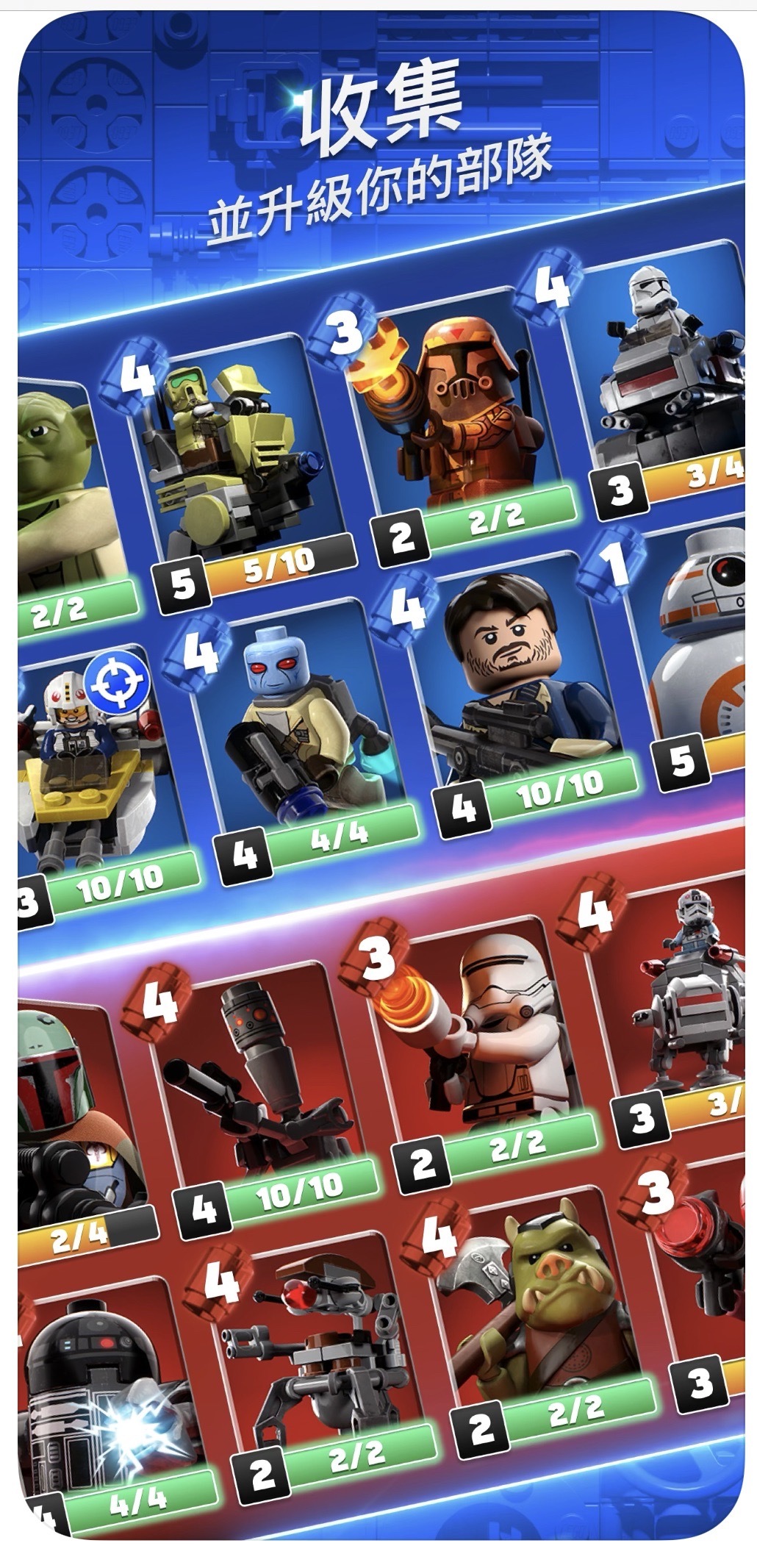 在遊戲進行時和每一次取得勝利,都能解鎖搜集更多角色,包含波波、風暴兵、機械兵等,還有尤達大師、賞金獵人波巴的神力技能等待被發掘。替你增加攻擊和防禦力的 AT AT 走獸、鈦轟炸機、千年鷹號等大型運載器也都在這個無垠宇宙裡。