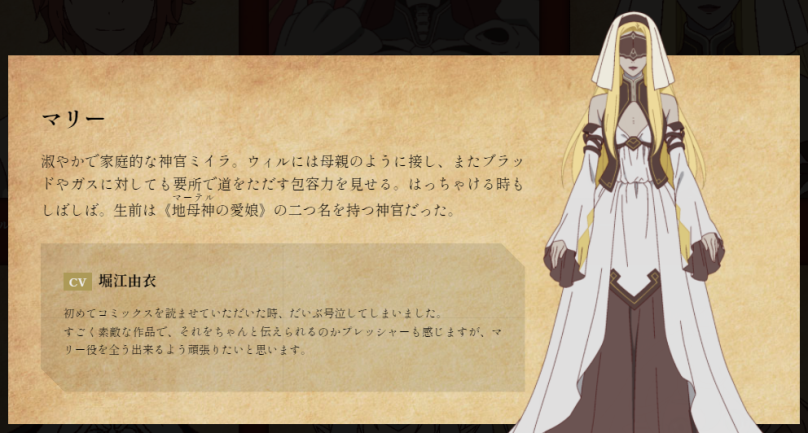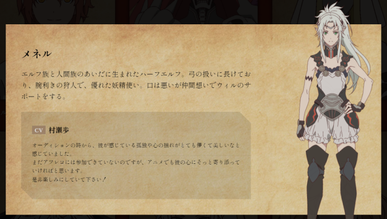 聲優陣容則包括河瀨茉希(飾:威爾)、小西克幸(飾:布拉德)、堀江由衣(飾:瑪利)、飛田展男(飾:古斯)、村瀨步(飾:梅尼爾多)、悠木碧(飾:燈火之女神)、高橋廣樹(飾:不死神)......等人。