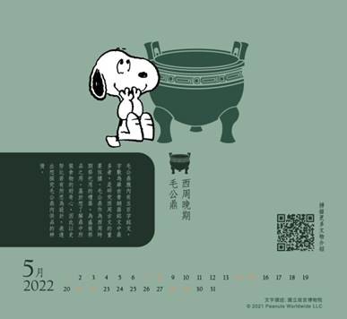 5、6 月份則是由西周晚期的「毛公鼎」出鏡。毛公鼎身為最知名的青銅器及故宮的鎮院之寶,歷經各時代的顛沛流離傳承到現代,本身的故事宛如一幕幕歷史剪影,所以將 SNOOPY 的剪影形象以及切題的青銅綠色,完美平衡過於沉重的歷史印記。