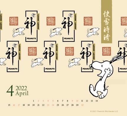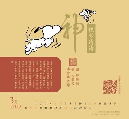 春日氣息滿滿的 3、4 月份,帶大家欣賞超應景的—晉朝「王羲之快雪時晴帖」之神妙。乾隆曾以「龍跳天門,虎臥鳳閣」形容王羲之的書法風格,又曾在書帖上題了「神」字來表達對此作品的欣賞。因此設計 SNOOPY 為龍跳天門的「龍」搭配乾隆題字及鈐印,呈現SNOOPY和此作品融為一體的妙趣。