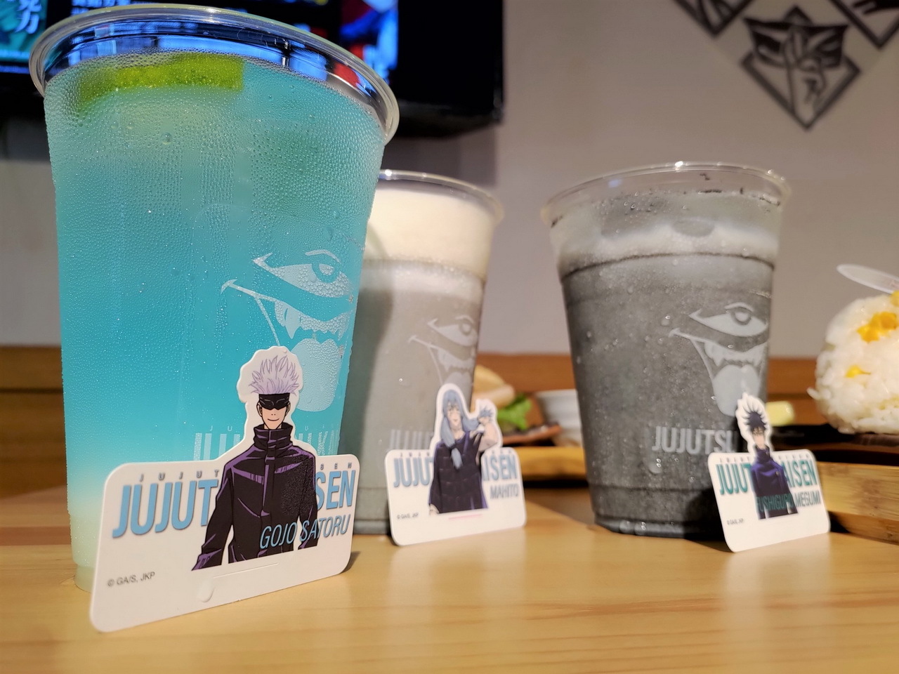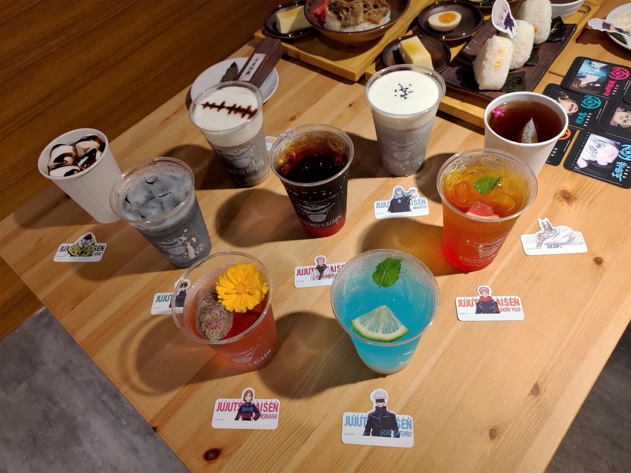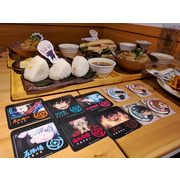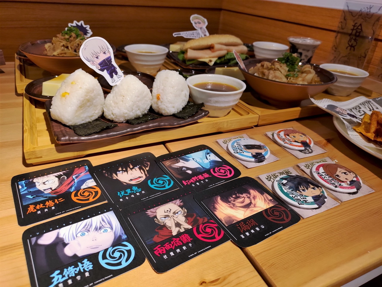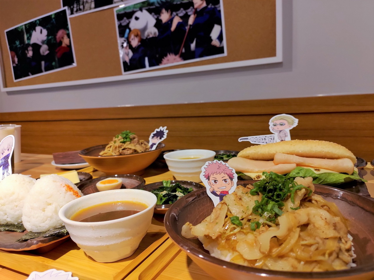 這次的主題餐點特別推出了美味的虎杖燒肉丼和伏黑牛丼,另外還有真希學姊的炸物拼盤、狗卷學長口中總是唸著各種配料的飯糰、七海上班族時期最愛的三明治等,共五種主餐。甜點有貓熊學長的黑白仙草奶凍、五條悟印記的冰淇淋大福、釘崎的野薔薇造型蛋糕,飲料方面則有著 9 種角色印象飲品可以選擇。所有的主餐、甜點與飲品皆提供內用和外帶服務。餐點或飲料將同時搭配專屬的角色插卡或吸管套,購買飲品還可獲得一張特典杯墊,共計有 13 款,分為兩波隨機發送。