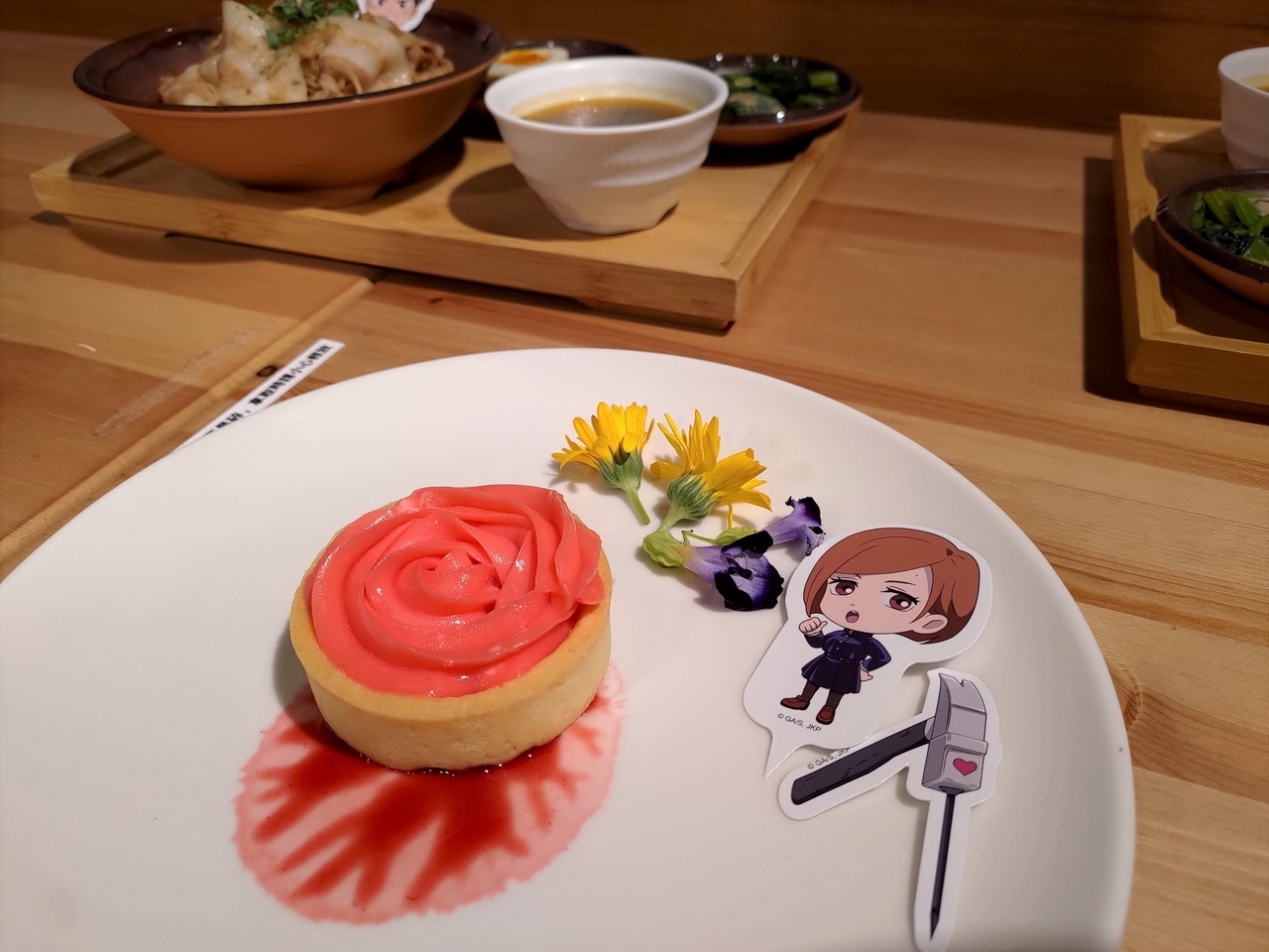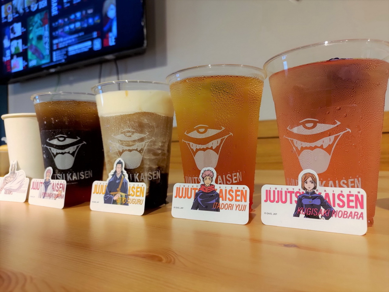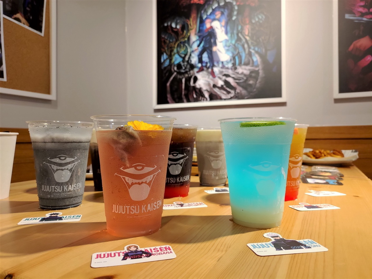 這次的主題餐點特別推出了美味的虎杖燒肉丼和伏黑牛丼,另外還有真希學姊的炸物拼盤、狗卷學長口中總是唸著各種配料的飯糰、七海上班族時期最愛的三明治等,共五種主餐。甜點有貓熊學長的黑白仙草奶凍、五條悟印記的冰淇淋大福、釘崎的野薔薇造型蛋糕,飲料方面則有著 9 種角色印象飲品可以選擇。所有的主餐、甜點與飲品皆提供內用和外帶服務。餐點或飲料將同時搭配專屬的角色插卡或吸管套,購買飲品還可獲得一張特典杯墊,共計有 13 款,分為兩波隨機發送。