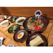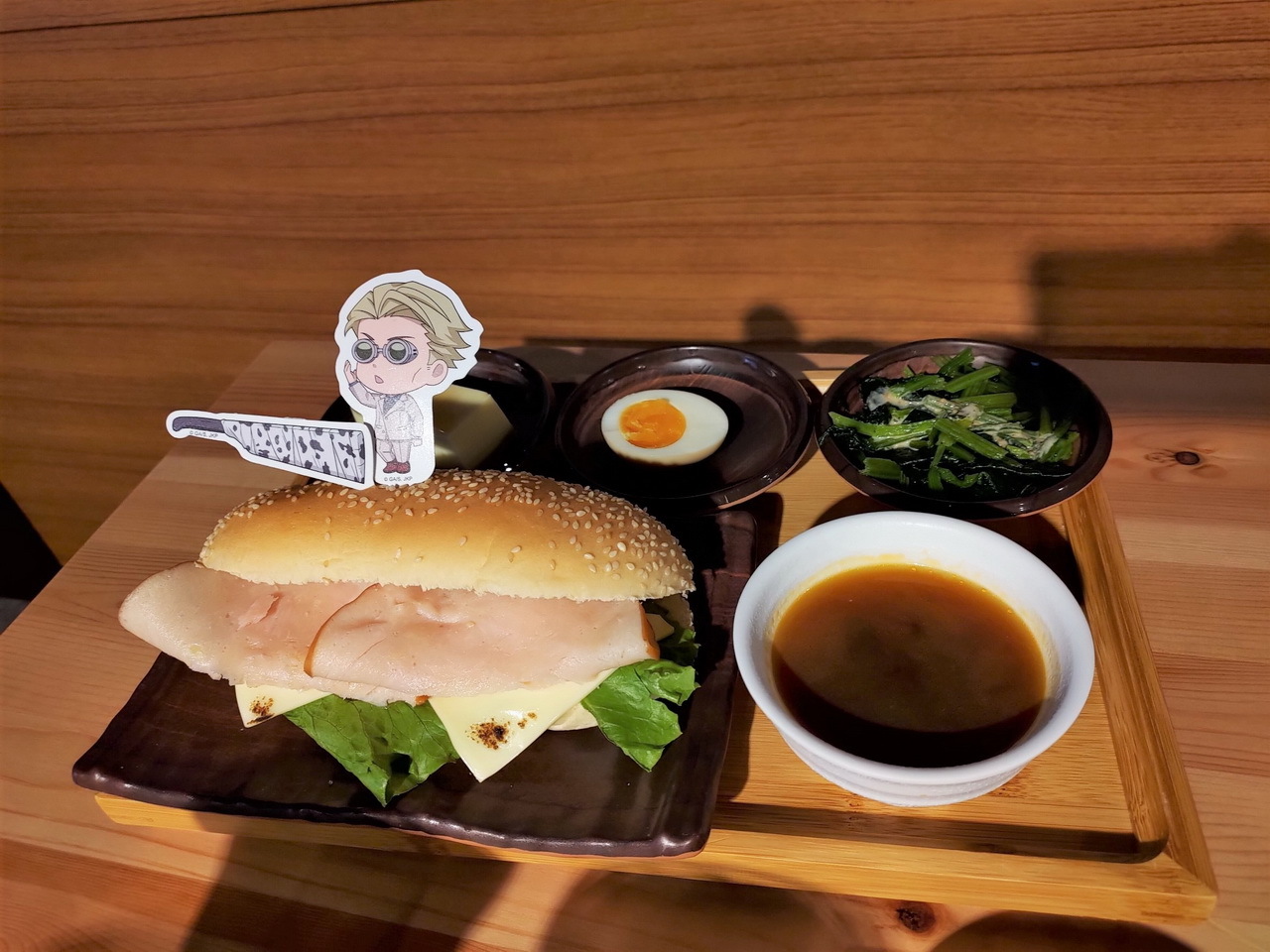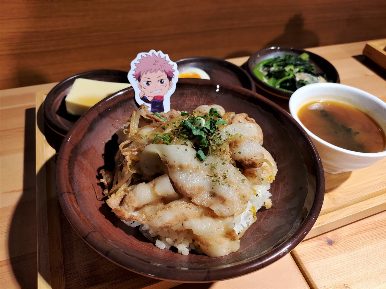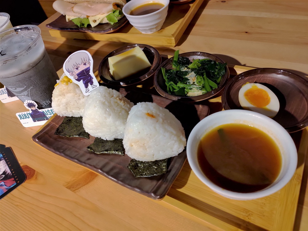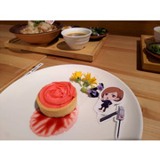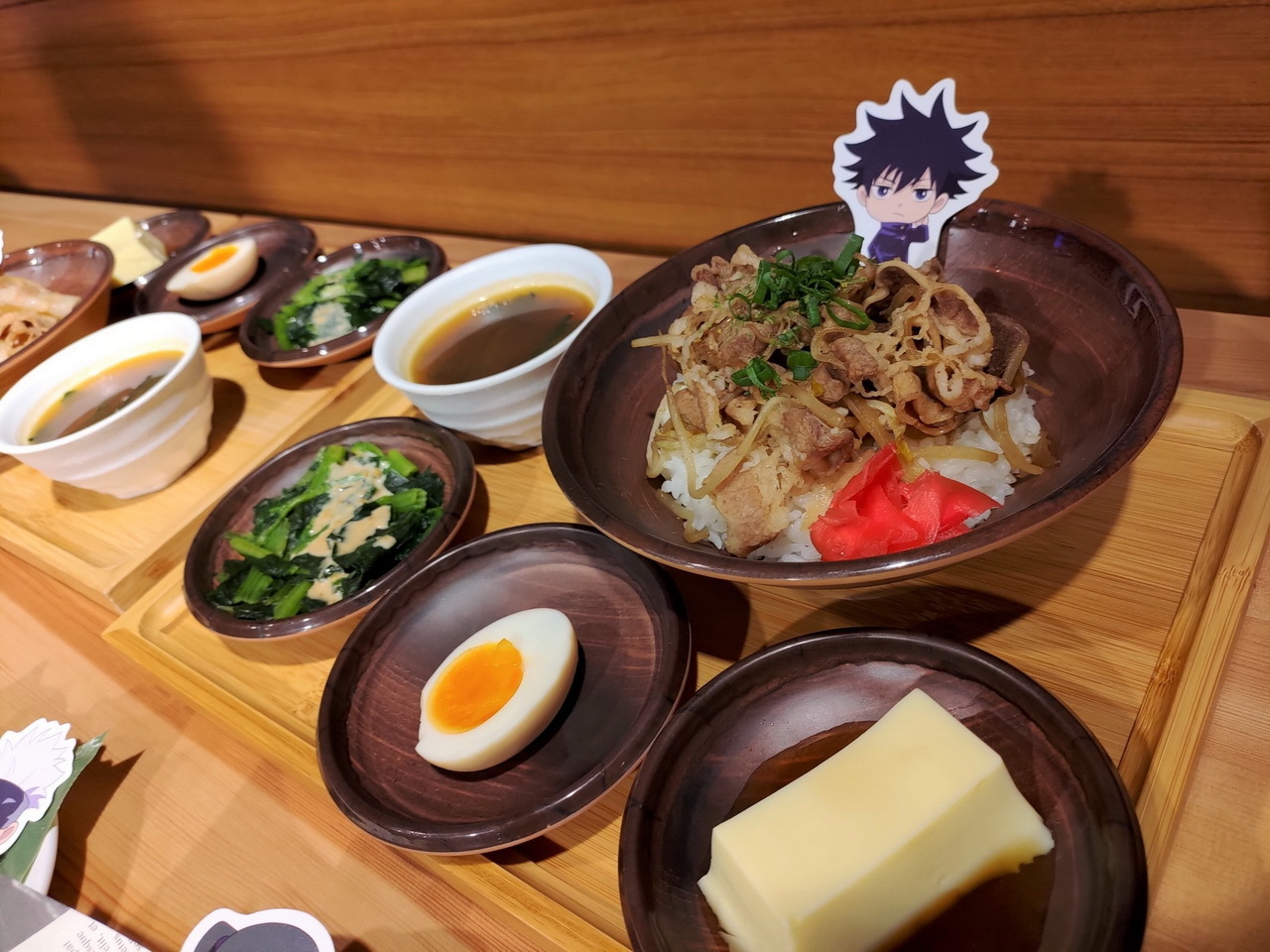 這次的主題餐點特別推出了美味的虎杖燒肉丼和伏黑牛丼,另外還有真希學姊的炸物拼盤、狗卷學長口中總是唸著各種配料的飯糰、七海上班族時期最愛的三明治等,共五種主餐。甜點有貓熊學長的黑白仙草奶凍、五條悟印記的冰淇淋大福、釘崎的野薔薇造型蛋糕,飲料方面則有著 9 種角色印象飲品可以選擇。所有的主餐、甜點與飲品皆提供內用和外帶服務。餐點或飲料將同時搭配專屬的角色插卡或吸管套,購買飲品還可獲得一張特典杯墊,共計有 13 款,分為兩波隨機發送。