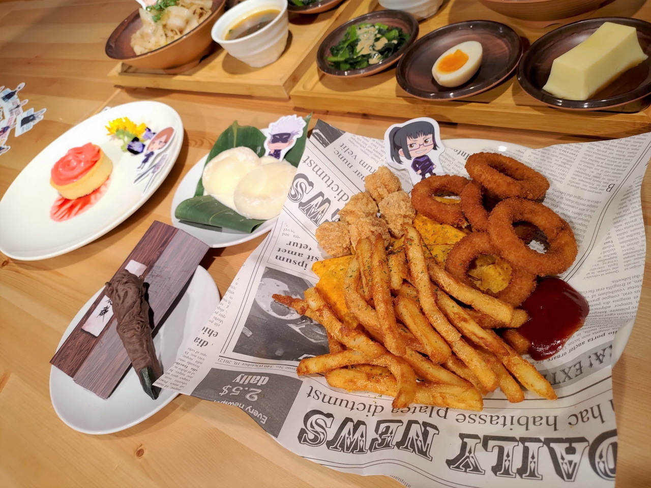 在主題餐飲部分推出專為虎杖、伏黑、釘崎、五條老師...等人氣角色量身訂做的主餐、甜點和飲料。此外,這次更特別打造了立體的宿儺手指巧克力,將宿儺手指的造型與紋路還原。除了餐飲之外,現場也將推出全系列由 FANFANS 粉粉獨家設計的帽子、短 T、毛巾、霧黑馬克杯、不銹鋼吸管杯、卡套、胸章、滑鼠墊、雷雕木盤、方鏡等,數十款周邊。