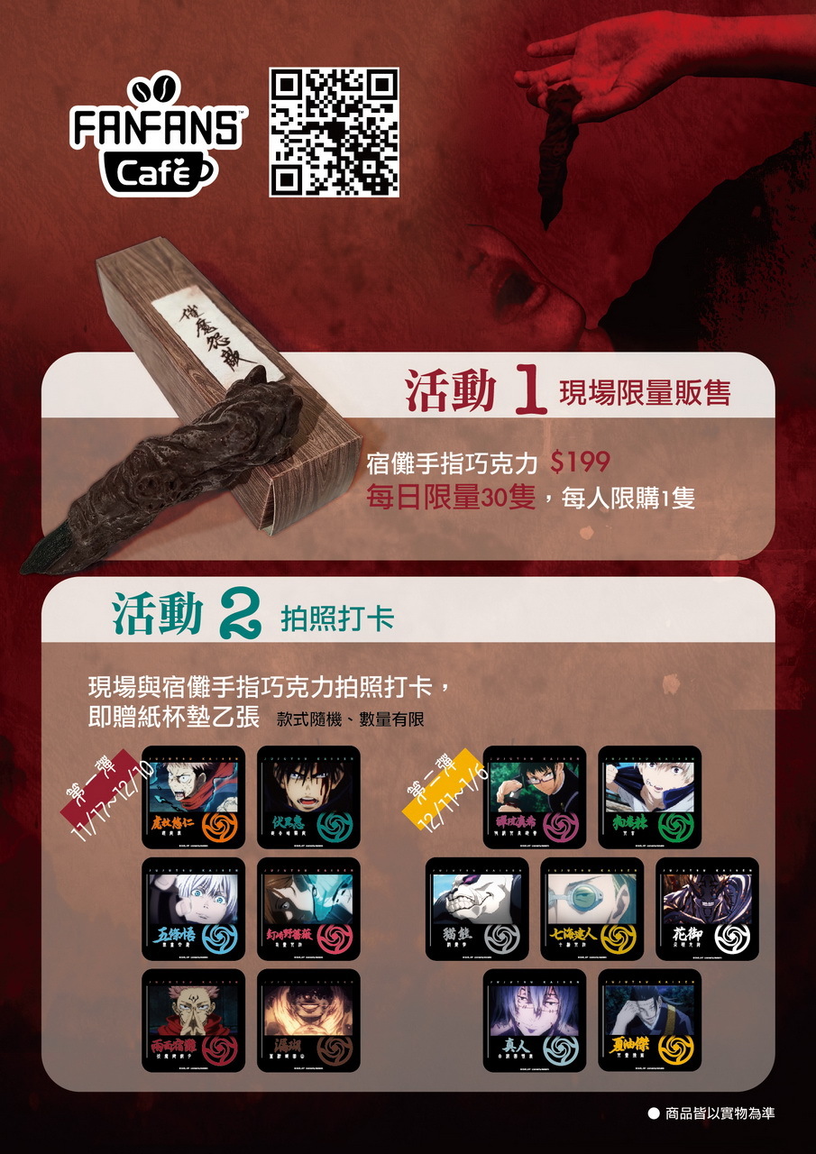 特別值得注意的是,本次推出了宿儺手指的巧克力,利用 3D 立體建模的外觀非常精緻,連指甲蓋的部份都做得維妙維肖。宿儺手指巧克力每日現場僅限量 30 根,只要現場購買並與宿儺手指巧克力一起拍照打卡,即可獲得款式隨機的特典紙杯墊乙個。