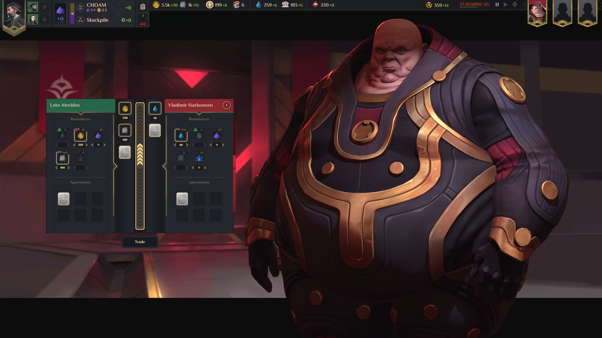 香料是宇宙中最珍貴的資源,除了能延年益壽之外,還能擴張意識,讓星際旅行變得有可能。玩家將可在本作中創造屬於自身的傳記,從數個熟悉的派系進行選擇來進行遊戲,包含亞崔迪家族(House Atreides)及哈肯尼家族(House Harkonnen),爭奪對於沙丘以及香料的掌控權力。