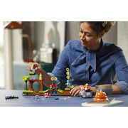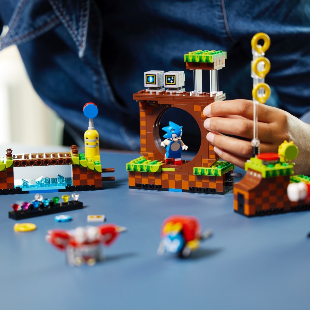 音速小子》系列最具代表性的「碧山區域」關卡,包括如茵的綠草,橫渡河流的木橋,以及 360 度大迴旋的跑道等場景,還有道具箱、金環、彈跳台、等待玩家收集的七彩混沌寶石等。玩家可以在場景中設置把玩化為樂高玩偶的主角索尼克,以及由樂高積木組成的機器螃蟹、機器瓢蟲與搭乘飛行載具的蛋頭博士等敵人。
