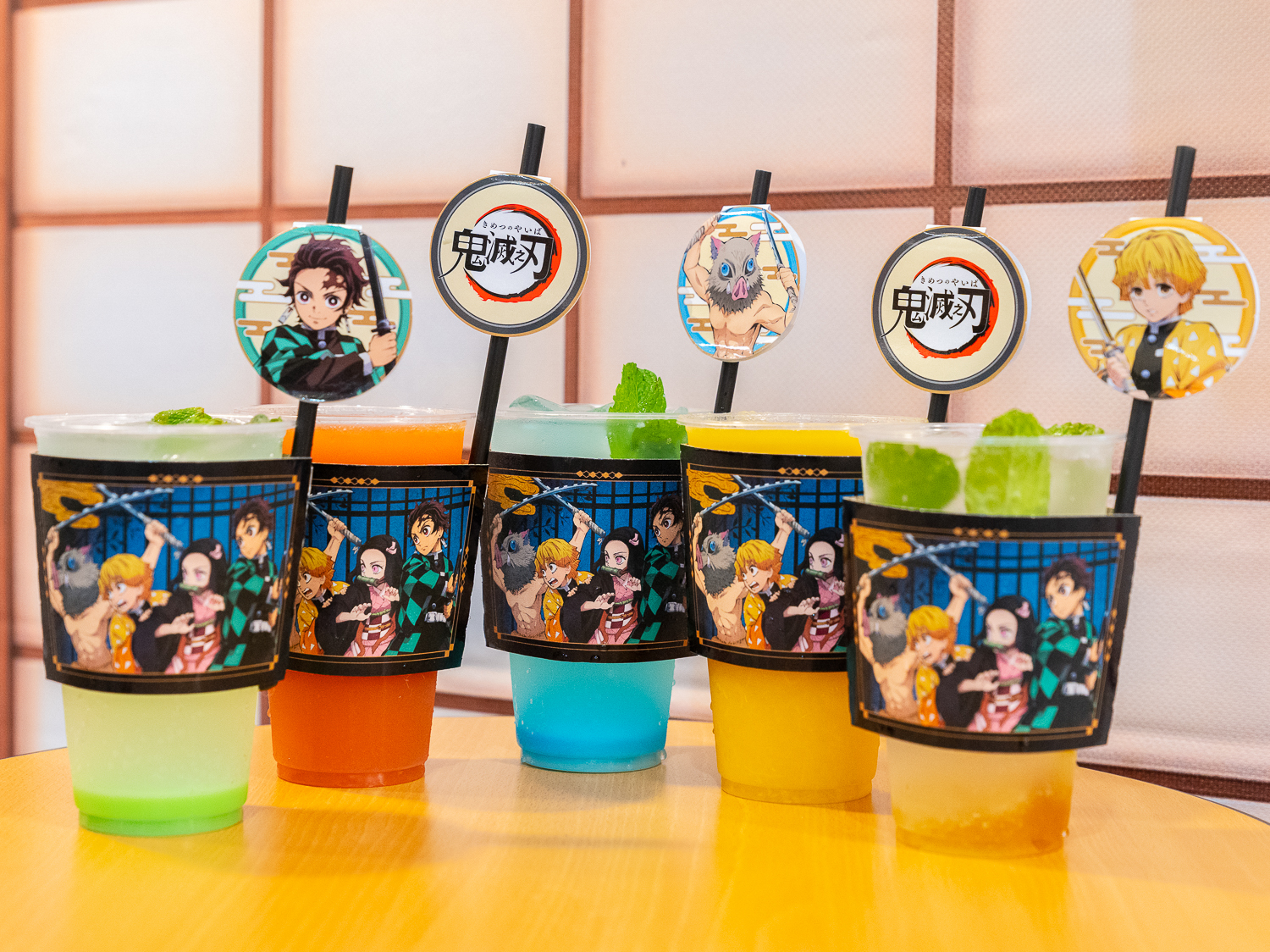 飲品的部分則有以炭治郎、善逸、伊之助三人的經典代表配色為靈感的「角色氣泡飲」,研發出薄荷優酪氣泡飲、蜂蜜柚子氣泡飲及藍甘菊檸檬氣泡飲,搭配角色插卡與造型杯套。還有「鬼滅之刃果汁系列」,共有柳橙汁、紅葡萄柚綜合果汁兩種口味,也都附上 logo 插卡與造型杯套。此外,官方同時表示,屆時購買「炎柱燒肉便當」即可以 49 元加購角色氣泡飲;購買「禰豆子木箱蛋糕」也能用 99 元加購的噴塗拉花飲品乙杯。