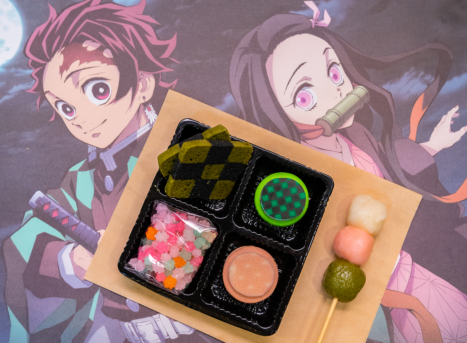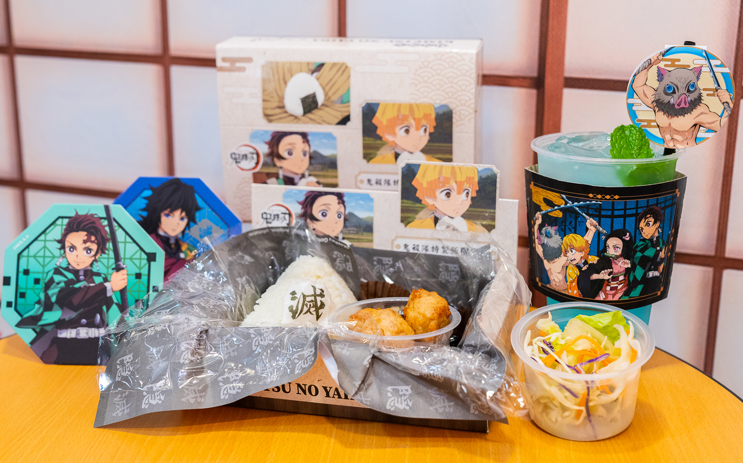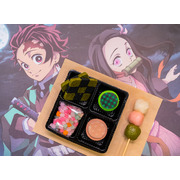 在餐點的部分,繼高雄場推出「炎柱燒肉定食」後,飽食系餐點第二波「鬼殺隊特製飯糰定食」將於本次的台北場推出。以特製鬼殺隊飯糰搭配雞肉丸、花椰菜等配菜,裝入造型餐盒中,皆具口味與造型。而「禰豆子木箱蛋糕」則參考動畫中炭治郎隨身揹著妹妹彌豆子的木箱造型,附上可愛的彌豆子造型插卡。此外還有將炭治郎花紋手工餅乾、甜蜜馬卡龍、禰豆子最愛金平糖及糯米丸子裝進質感木盒中的「兄妹點心盒」等多樣造型餐點。
