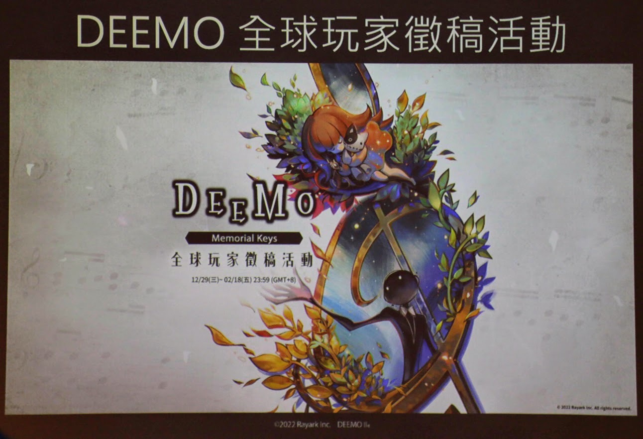 DEEMO II 世界中的入門歌曲是《Echo over you...》,平均遊玩成績為 97.13%。現場也同時揭露包含玩家們發現彩蛋及與各個居民(NPC)互動的各項數據,官方也表示,將會讓玩家持續期待未來能體驗到更多豐富的挑戰內容。