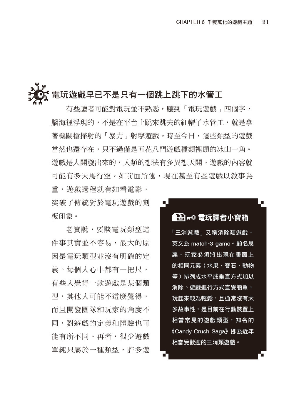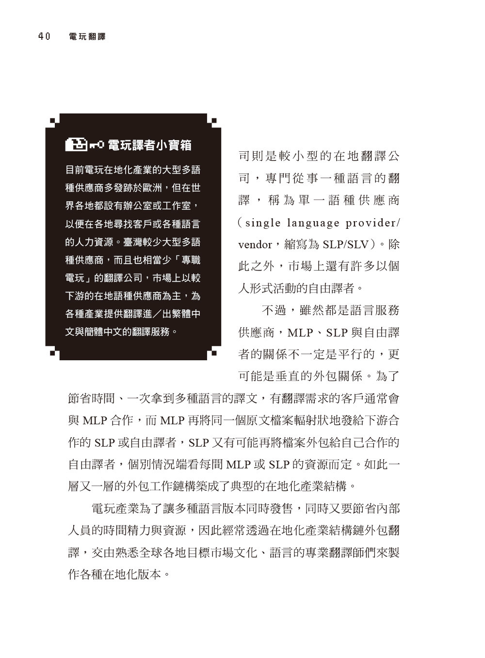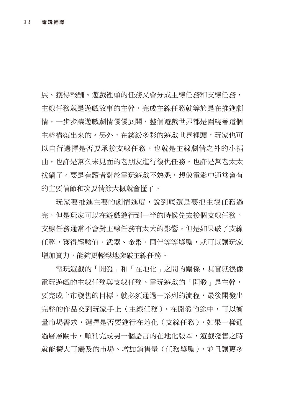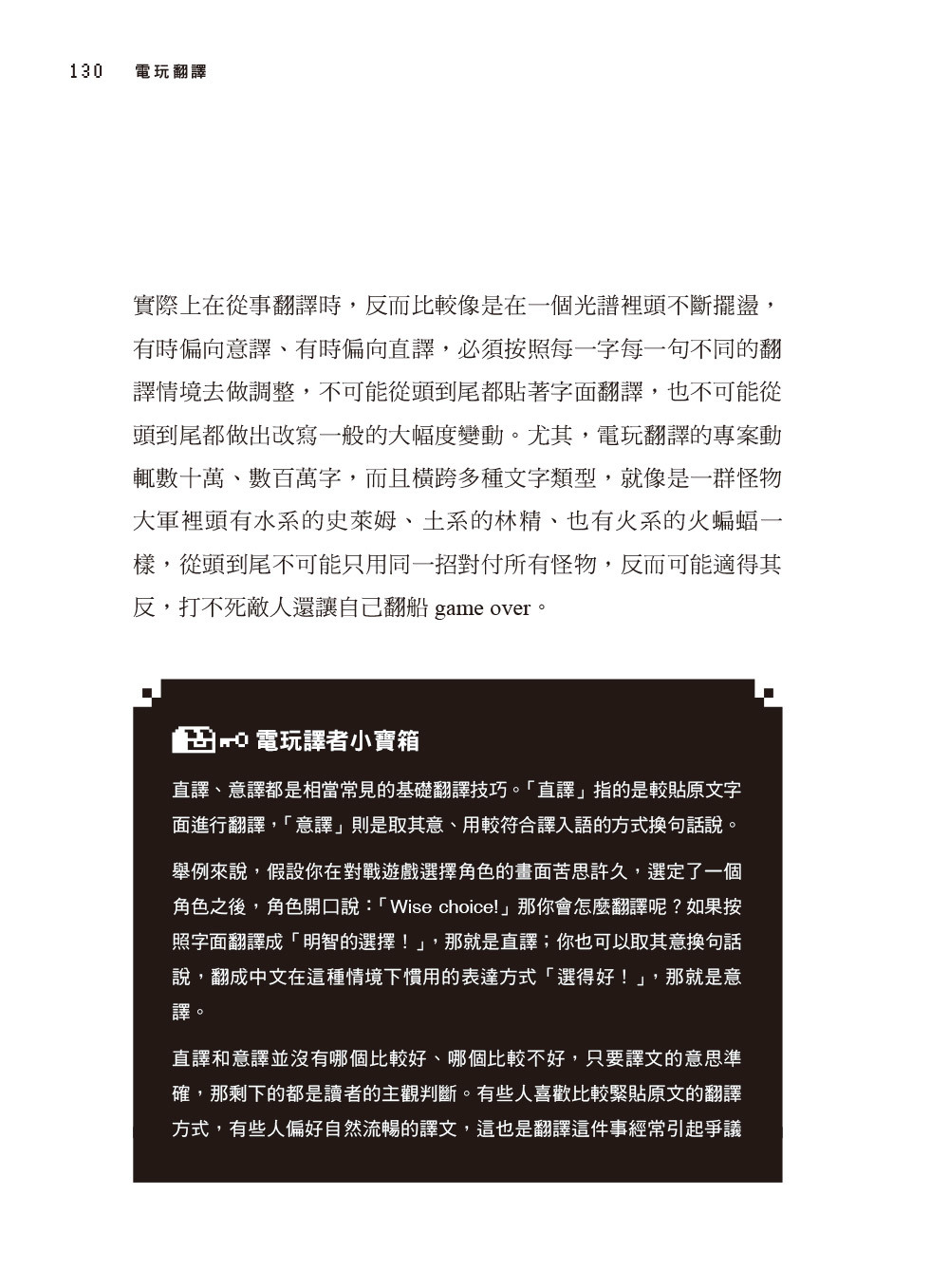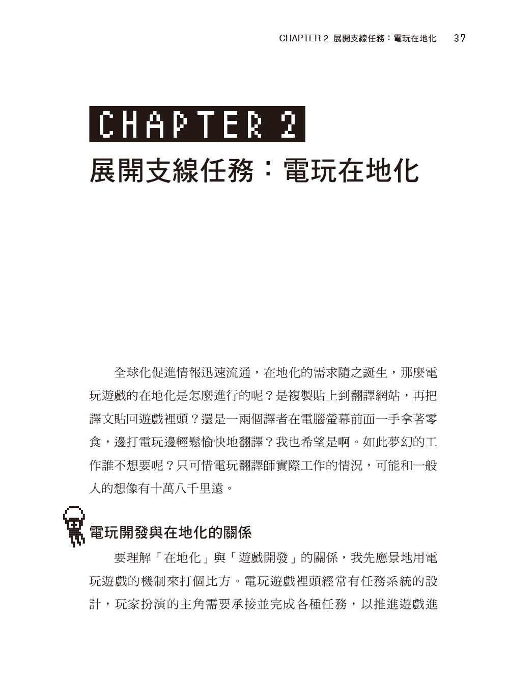 然而,實際從事此工作後,我才發現電玩的翻譯過程有多麼複雜,其中有太多眉角和難關都是旁人無法想像的。從玩家的角度無法想像實際翻譯作業的困難,而欲踏入此領域的學生、新手面前也有著相當高的門檻。電玩翻譯與其他類型的翻譯相比,有太多獨特的挑戰,容易使新踏入此領域的譯者感到不知所措、難以應付,而端出不及格的譯文,早早被客戶淘汰出局。更可惜的是,研究、教導此領域的學者在全世界幾乎寥寥可數,就我所知臺灣也僅有兩位老師(包括我)在大學開過相關課程,但是偏偏市場需求愈來愈大,也有愈來愈多學生對電玩翻譯產生興趣。在地化產業需要的人才愈來愈多,但翻譯市場上卻鮮少相關訓練課程。我已暫時卸下教師職位深造,不過也不願看到許多對電玩翻譯有興趣的學習者求助無門,因此才冒出了寫下這本書的念頭。希望這本書能夠以半經驗分享、半專門書籍的形式,為各位揭開電玩翻譯這個專門領域的神祕面紗。