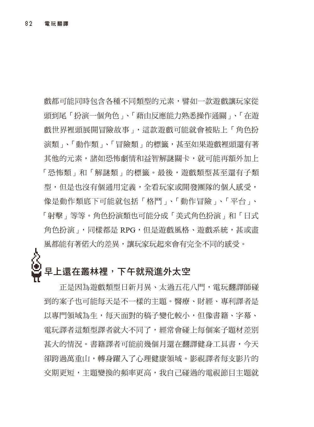 另外,雖然我自己的專業翻譯方向為英翻中,書裡提到的例子也是以英翻中為主,但其實這些特色與挑戰並不侷限於任一翻譯語種。只要是電玩翻譯,不管是中翻英、日翻中、日翻英、中翻泰、韓翻中…… 都會碰到書中介紹的挑戰。因此,即使你是英中以外語種的譯者,本書也應該能幫上你一些忙。