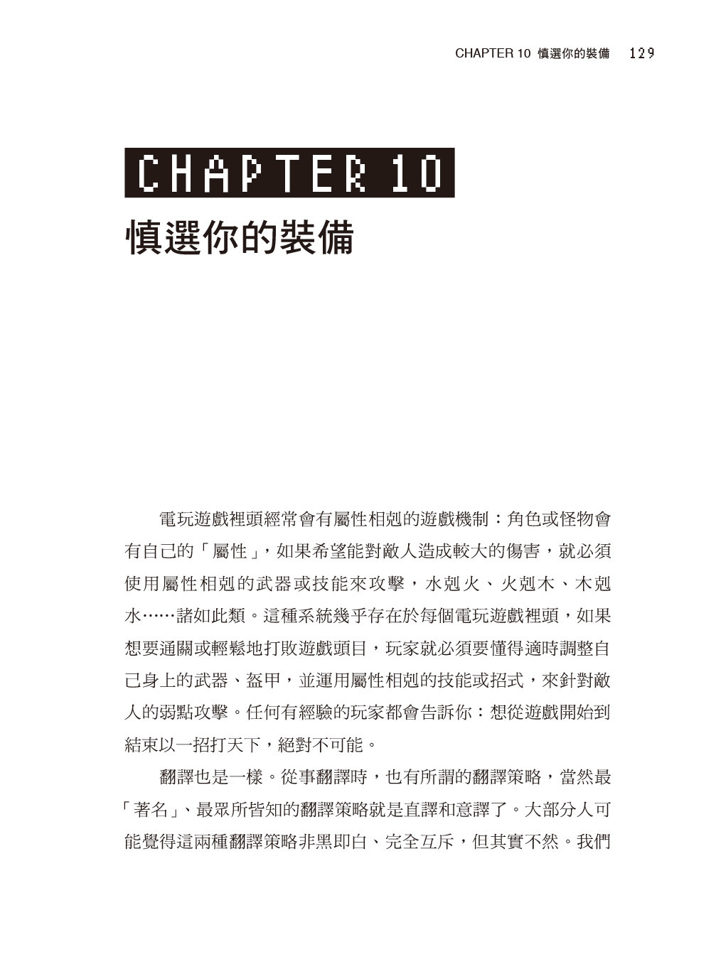 本書會著重介紹電玩翻譯產業的大方向、共通特色和挑戰,教導譯者該以怎樣的思考模式和策略應對,所以只會帶到一些基礎的翻譯技巧,如欲學習更多進一步的翻譯技巧,可參考眾文出版社其他翻譯教學相關書籍。