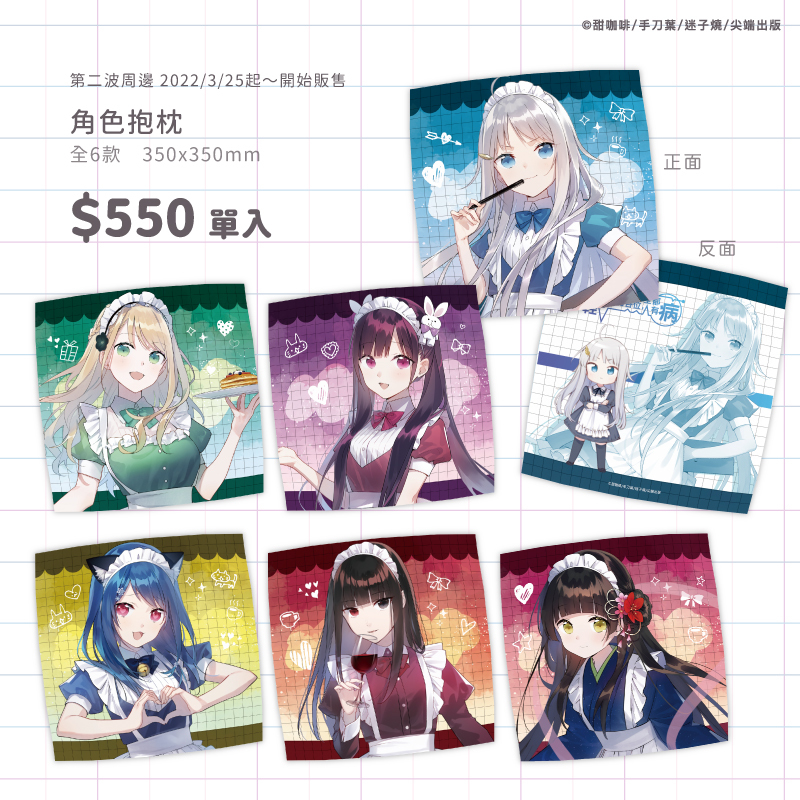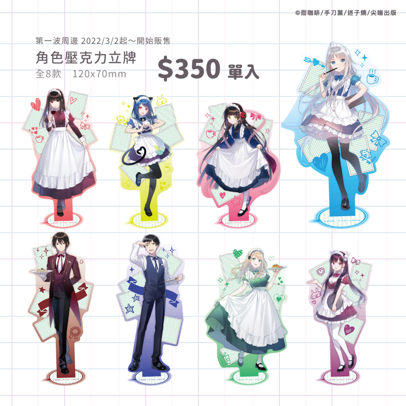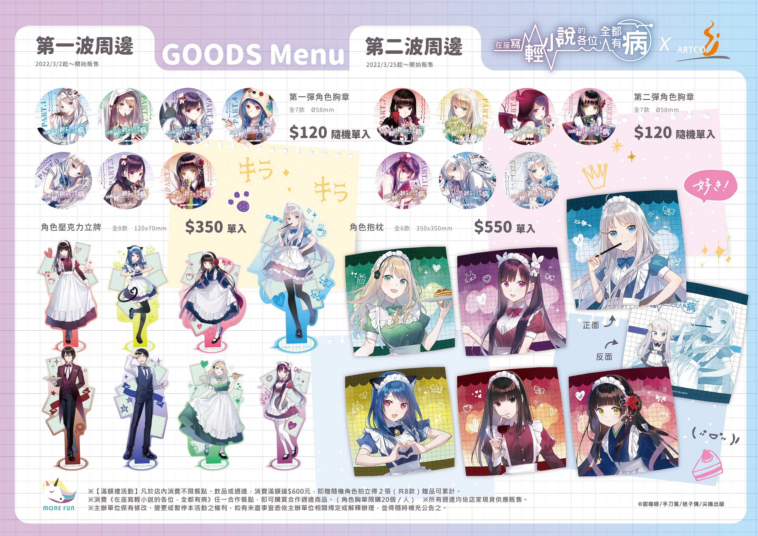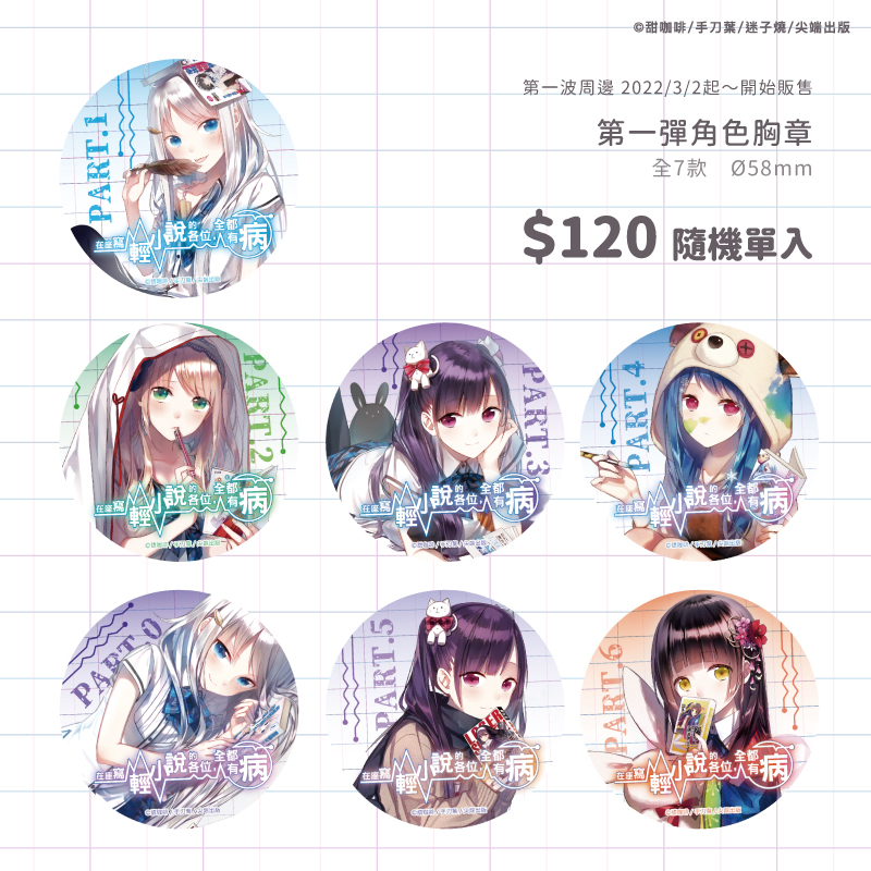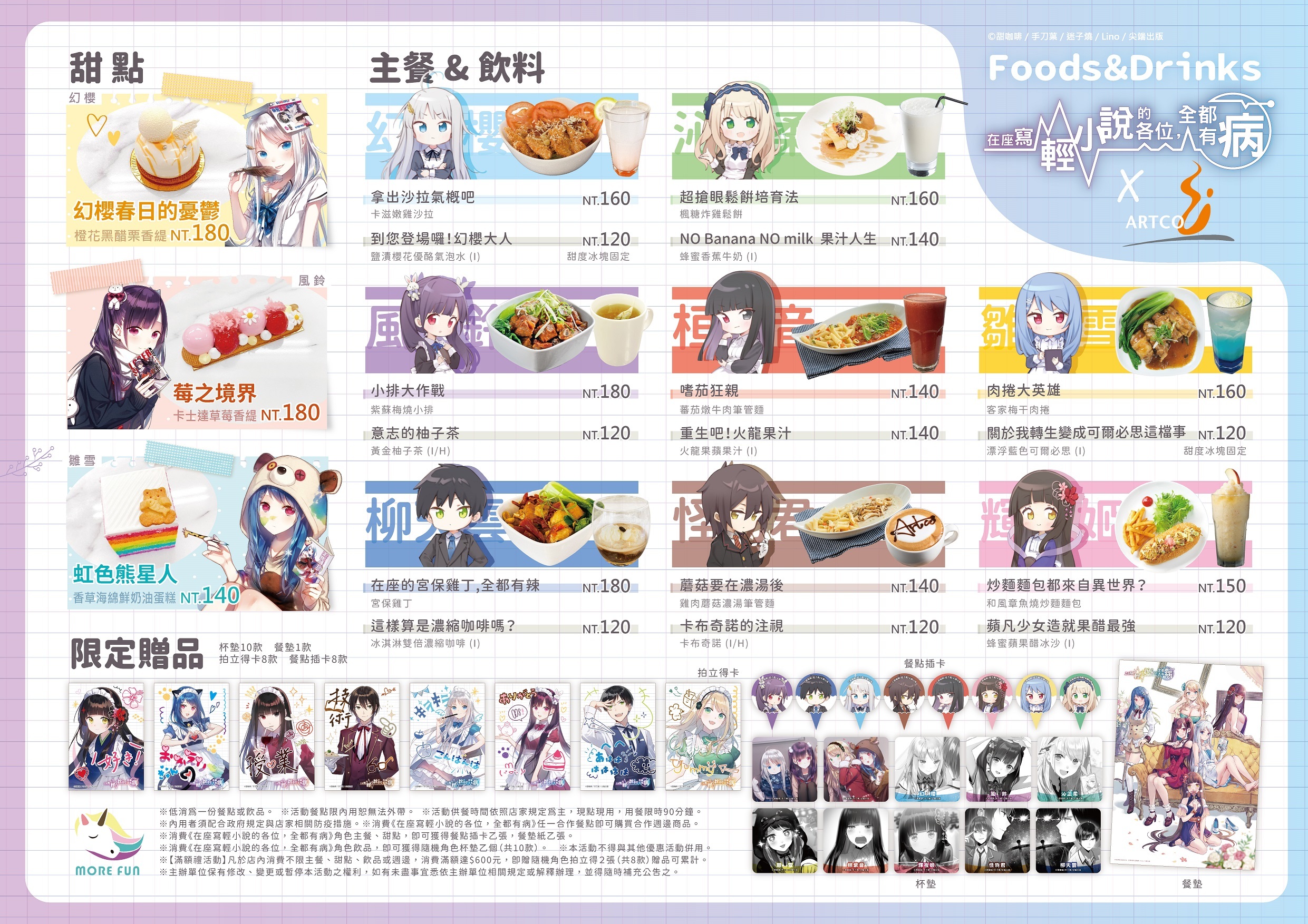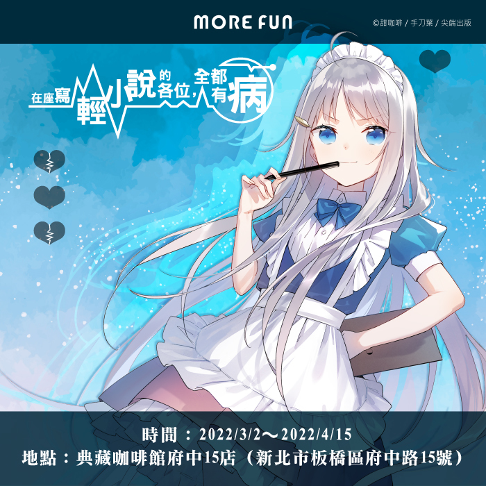 本次《在座寫輕小說的各位,全都有病》與「萌番動漫福利社」合作,將於 3/2~4/15 在「典藏咖啡館府中 15 店」推出主題Café,不僅有角色特製餐點,還有全新繪製的期間限定滿額贈與新周邊 ,提供給有興趣的人參考。