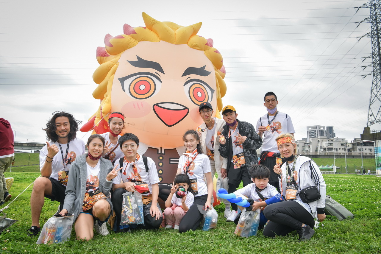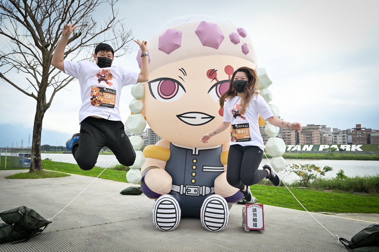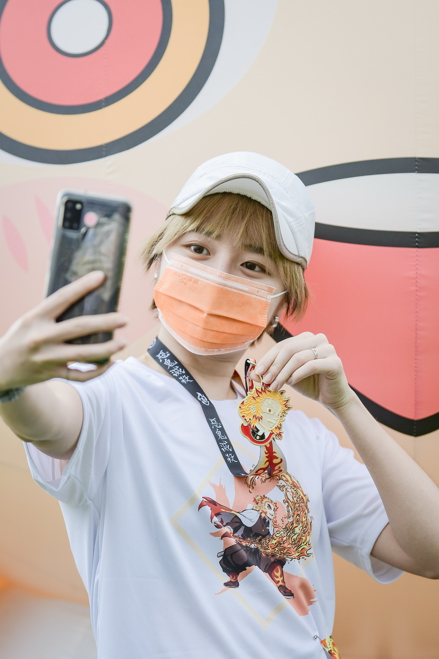 活動參與的跑者們,身著本次活動專屬、以炎柱煉獄杏壽郎為主角的全新設計路跑物資,賽道沿途設置了多座3公尺高的角色Q版氣偶,除了四位主角——炭治郎、禰豆子、善逸和伊之助,最大亮點即是全球首發、初次曝光的兩座人氣角色氣偶,「炎柱」煉獄杏壽郎和「音柱」宇髄天元,到場同歡的鬼滅粉絲們,都迫不及待地與六大角色氣偶合照,還有許多精彩動畫場面和角色圖素的拍照點裝置,主會場設有
