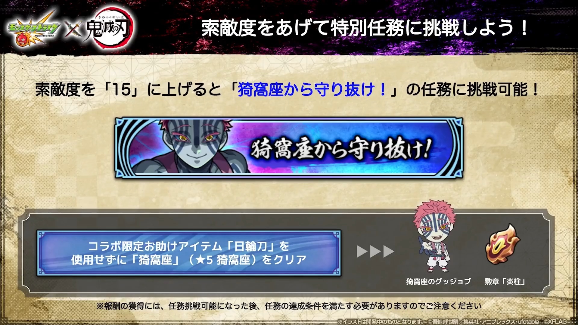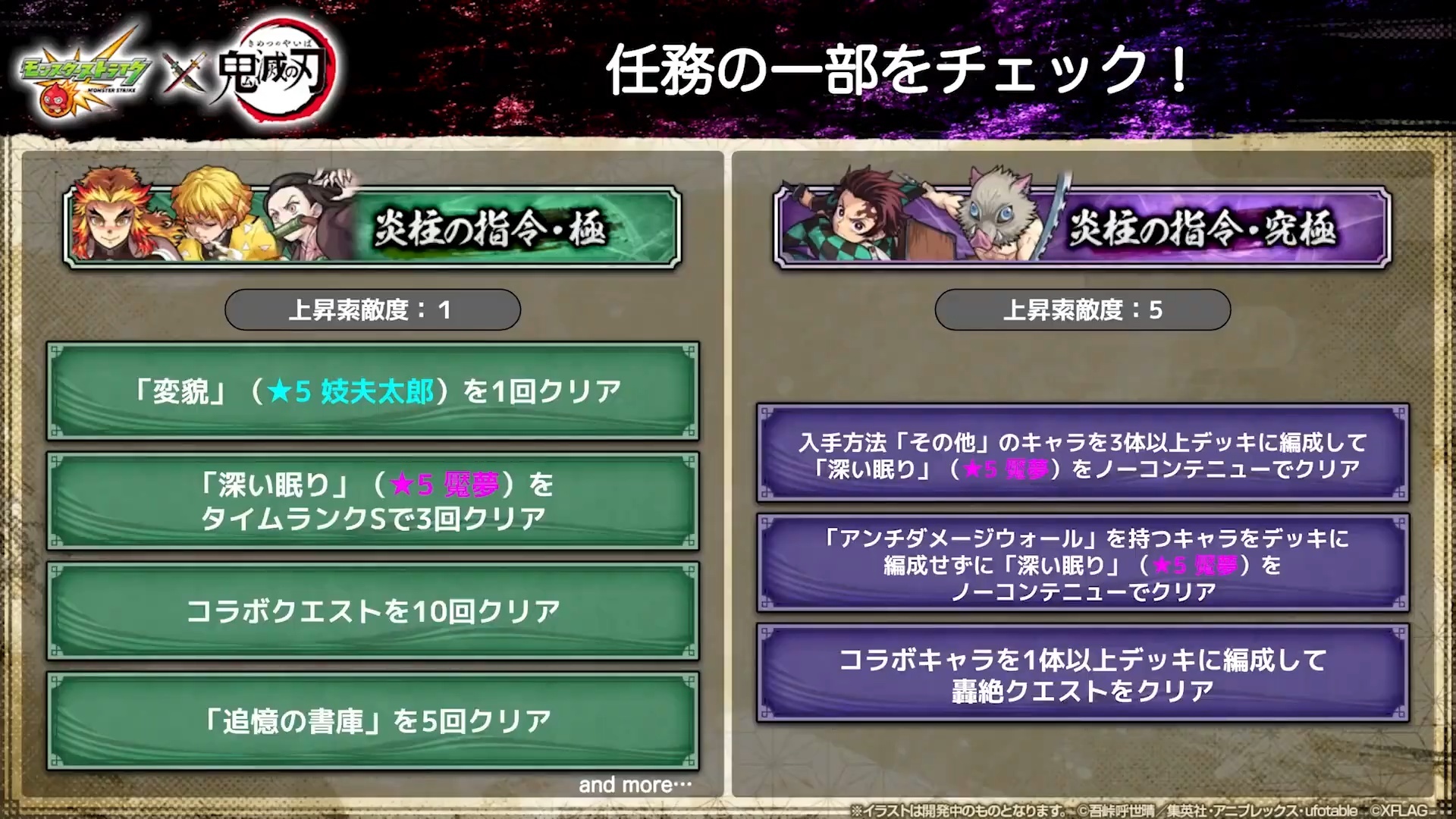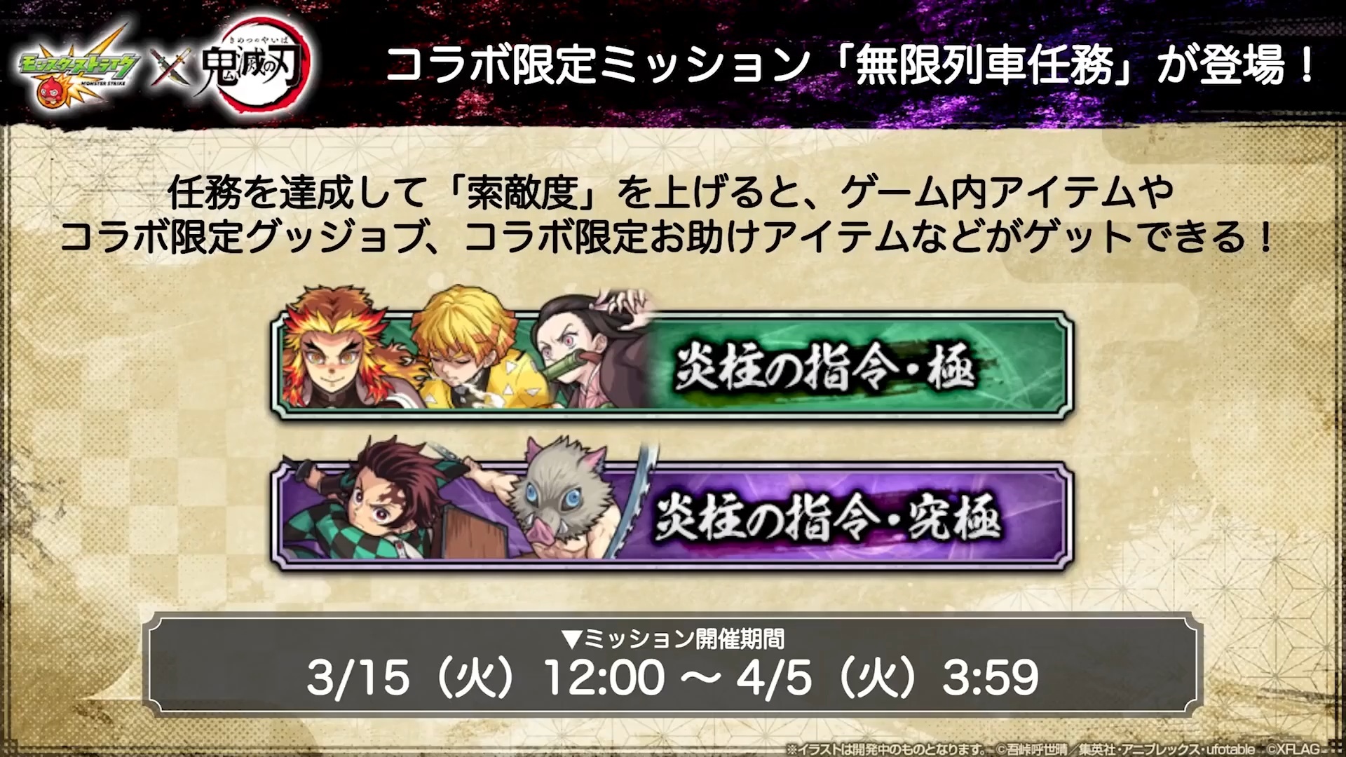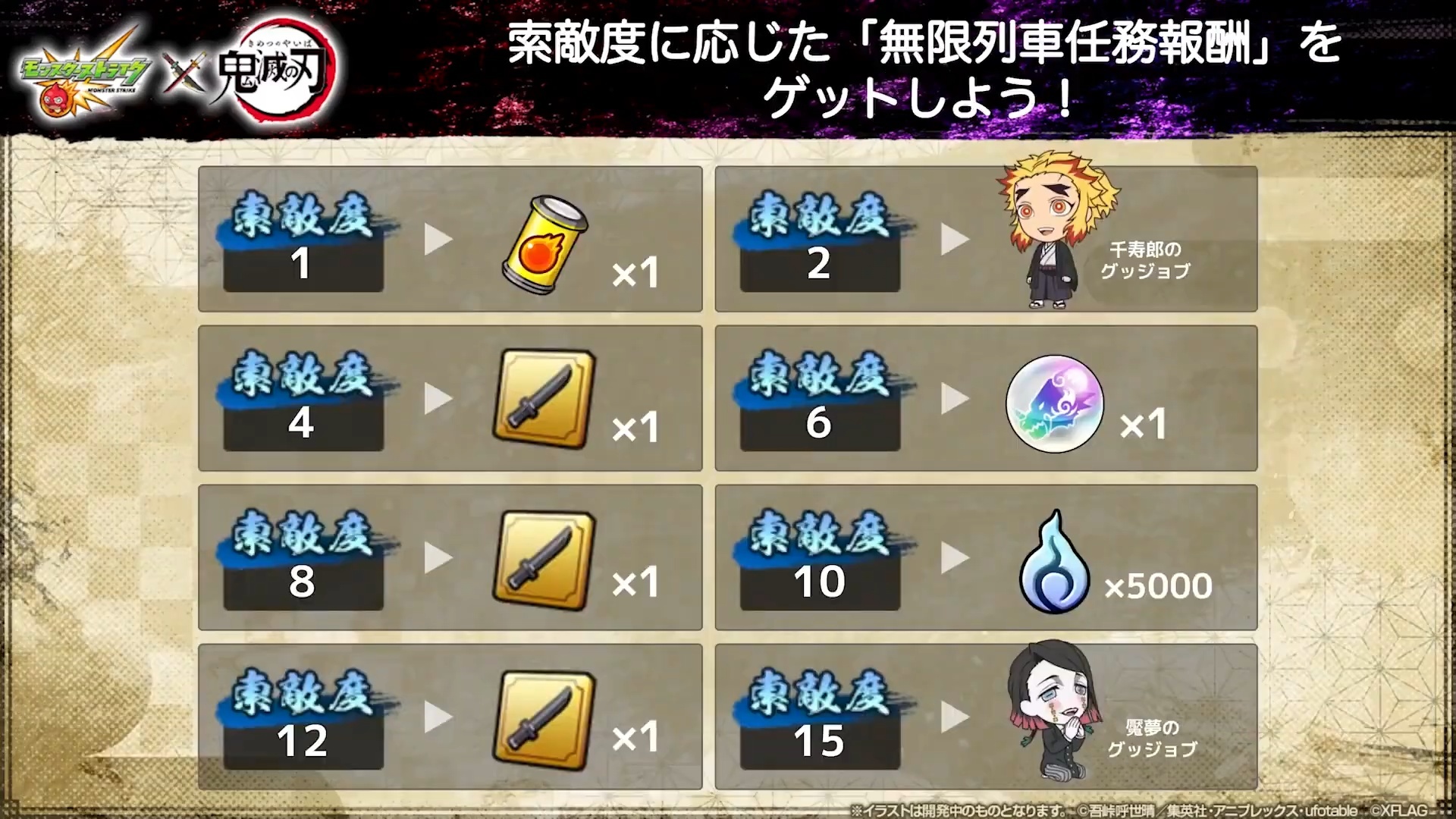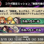 任務「無限列車任務」也同步登場,達成任務提升「索敵度」,來獲得遊戲內道具、合作限定 Good Job及合作限定支援道具等。